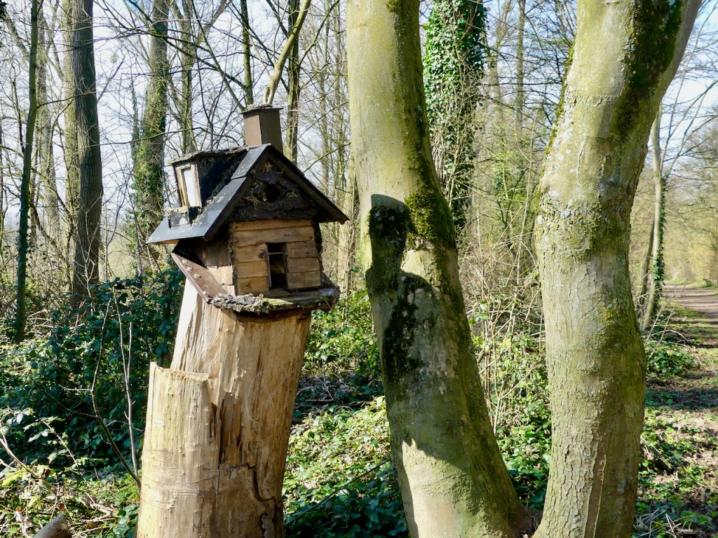 Auf einem Baumstumpf hat jemand ein kleines Haus gebaut.