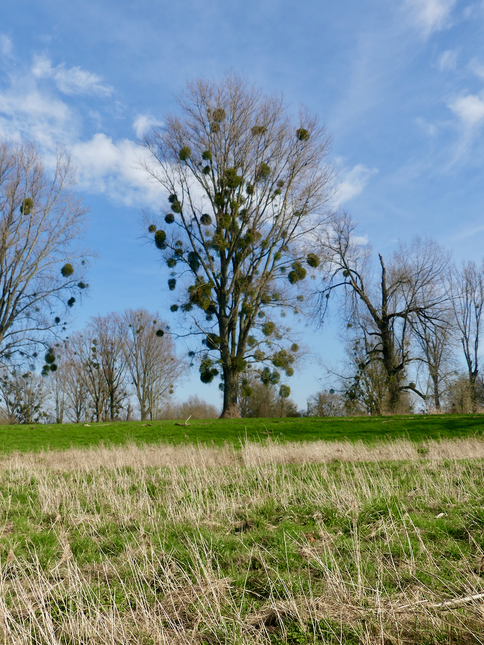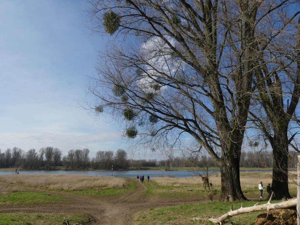 Allmählich verändert sich die Landschaft. Der Weg weicht vom Altrhein ab in eine Senke. Einige der Wiesen stehen noch unter Wasser. die Bäume sind mit Misteln dicht behangen. Es wird matschiger, bis ich schließlich den Rhein erreiche.