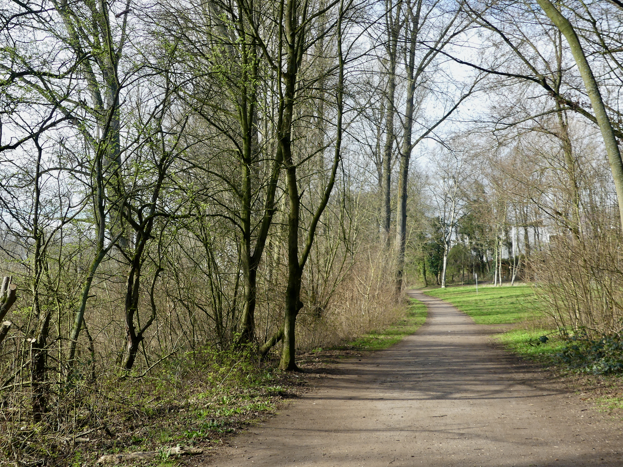 Der Weg beschreibt einen sanften Bogen rechts die Düsseldorfer Wohnbebauung und parkartige Einschübe mit Sitzbänken, links der Altrhein im Naturschutzgebiet. vor siebenhundert Jahren war hier noch das rechte Rheinufer. Erst bei einer Sturmflut, vermutlich im Jahr 1374, durchbrach der Rhein die Fluss-Schlinge und nahm die Abkürzung im Westen.