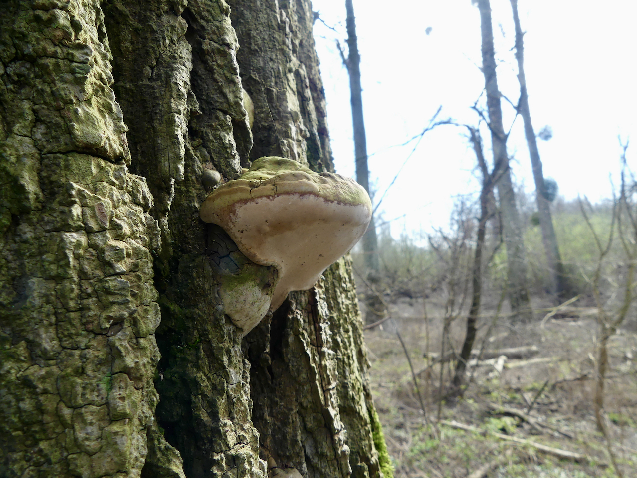 An abgestorbenen Bäumen wachsen irgendwelche Porlinge. Kann Zunderschwamm sein, ich enthalte mich der Stimme. Die größeren sind angeschnitten. Im Naturschutzgebiet! 😡 Sollen ja angeblich gesund sein.