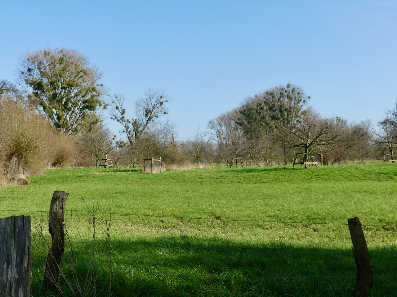 Allmählich verändert sich die Landschaft. Der Weg weicht vom Altrhein ab in eine Senke. Einige der Wiesen stehen noch unter Wasser. die Bäume sind mit Misteln dicht behangen. Es wird matschiger, bis ich schließlich den Rhein erreiche.