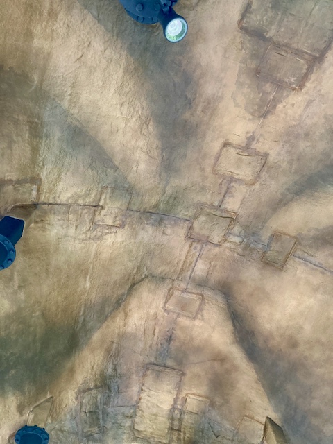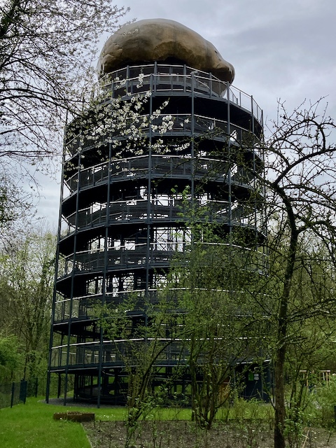 Der Turm markiert die Stelle, an der MR. N. gefunden wurde, ganz dort oben unterm Schädel. Der Weg nach oben erfolgt auch hier über Rampen. Von oben hat man einen guten Ausblick auf die ehemaligen Steinbrüche.