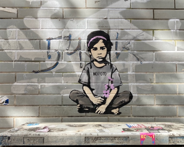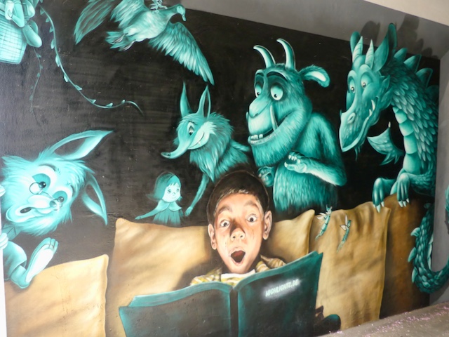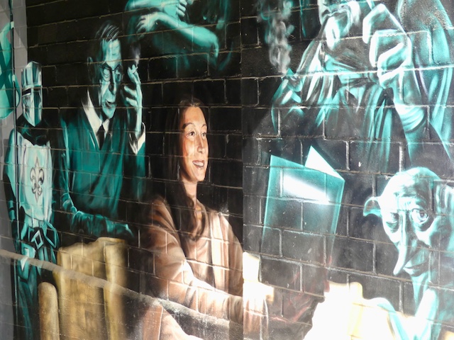 Nebenbei bemerkte ich einige schöne Grafitti. Vielleicht bin ich durch die Banksy-Ausstellung sensibilisiert. Jedenfalls ist mir das kleine Mädchen sofort aufgefallen. Und gleich danach schaute Dobby um die Ecke. Die beiden Murales befinden sich in der Einfahrt neben einer Buchhandlung. Ich stelle fest, dass ich mich mit zunehmendem Alter für Street-Art interessiere.