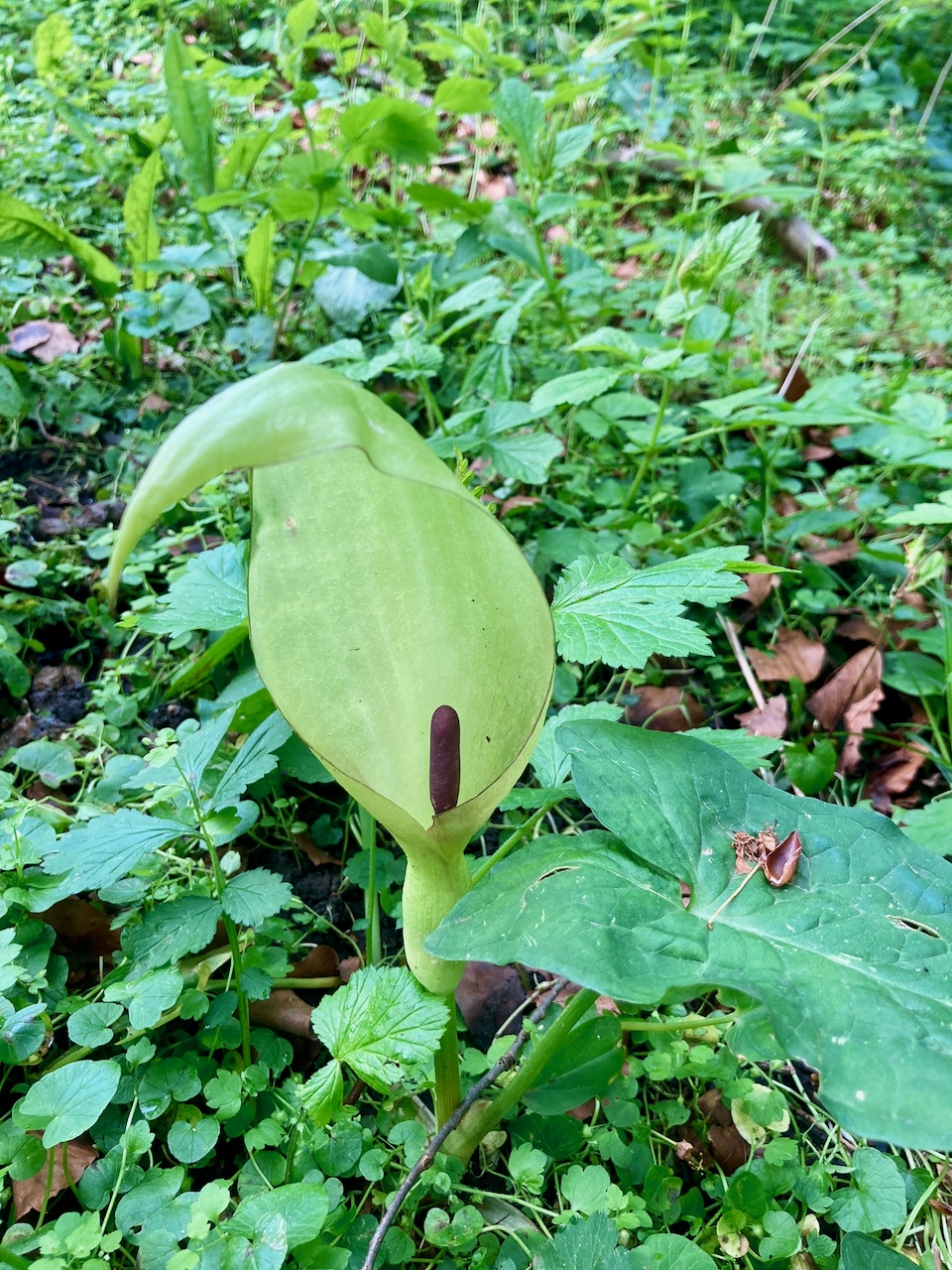 Ganz in der Nähe: Aronstab. Der Aronstab ist eine Fliegenkesselfalle. Mit intensivem Aasgeruch lockt er Fliegen in seine Kanne damit sie ihn bestäuben. Der gefleckte Aronstab war außerdem Giftpflanze des Jahres 2019.