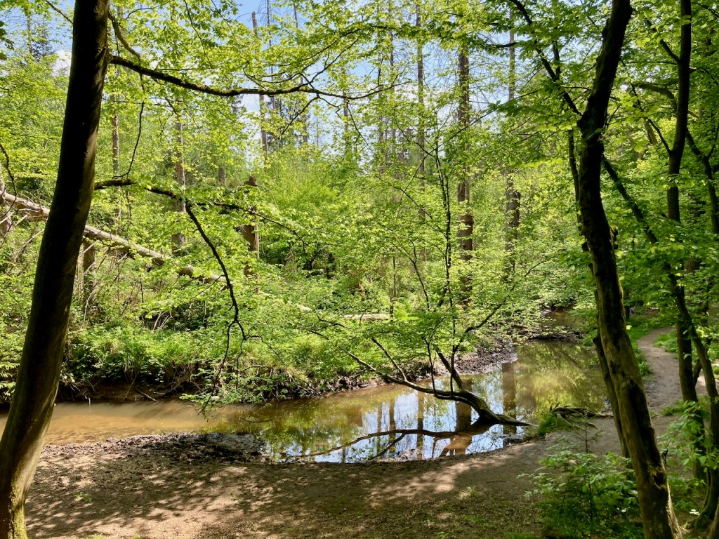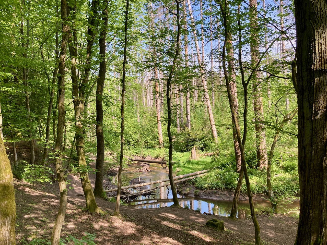 Also sitze ich im Wald an einer meiner Lieblingsstellen und schaue der natürlichen Sukzession unter toten Bäumen zu und dem Flehbach beim fließen und den Vögeln und etwas großem im Wasser. Bisam oder Fisch?. Vorher war auch hier düstere Fichtenplantage. Dann ändert sich die Luft fast unmerklich, ich fahre zurück und bin pünktlich zum Hagel wieder zu Hause.
