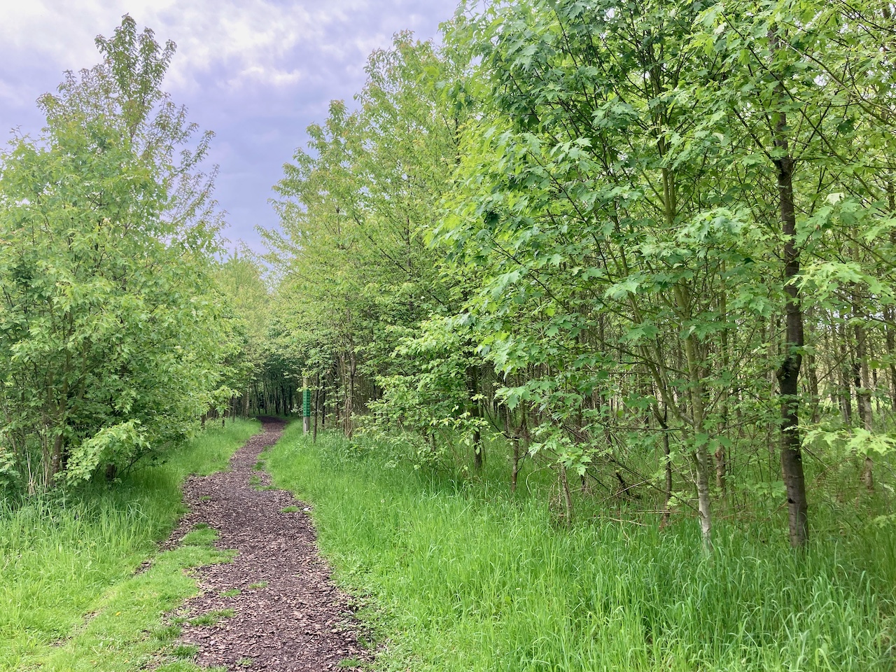 Verlässt man den Wandelwald, führt ein breiter Weg vor bei an den Parzellen von Energiewald und Klimawald, die durch breite Wiesen voneinander getrennt werden.