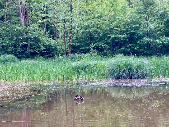 Der wirklich sehr kleine Teich liegt mitten im Gierather Wald und ich habe dort eine kleine Pause gemacht. Es scheint sich um einen ehemaligen Fischteich zu handeln, vergleichbar dem Mönchsweiher im Königsforst. Die Schwertlilien blühen gerade sehr schön, und ein einsamer Enterich paddelt im Teich. Ich habe dann noch eine kleine Runde durch den Wald gedreht und bin auf bekannter Strecke über Rinderweg zurück gefahren.