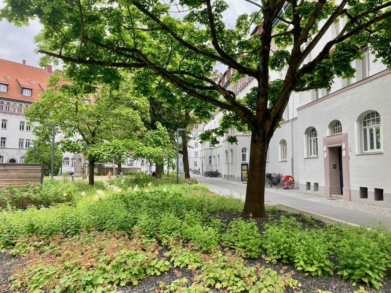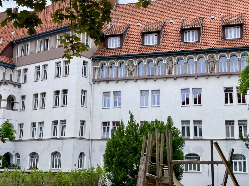 Von der Christuskirche und dem Pfarr- und Gemeindehaus ließ ich mich gern vom geraden Weg ableiten. In der Straße am Judenkirchhof sah ich etwas weißes blinken. Neugierig betrat ich die Toreinfahrt und landete in einem wunderschönen, begrünten Innenhof, dem Brüggemannhof. Die genossenschaftliche Kleinwohnungsanlage entstand 1912-1924 und steht heute unter Denkmalschutz. diese Oase in der Innenstadt hatte ich nicht erwartet.