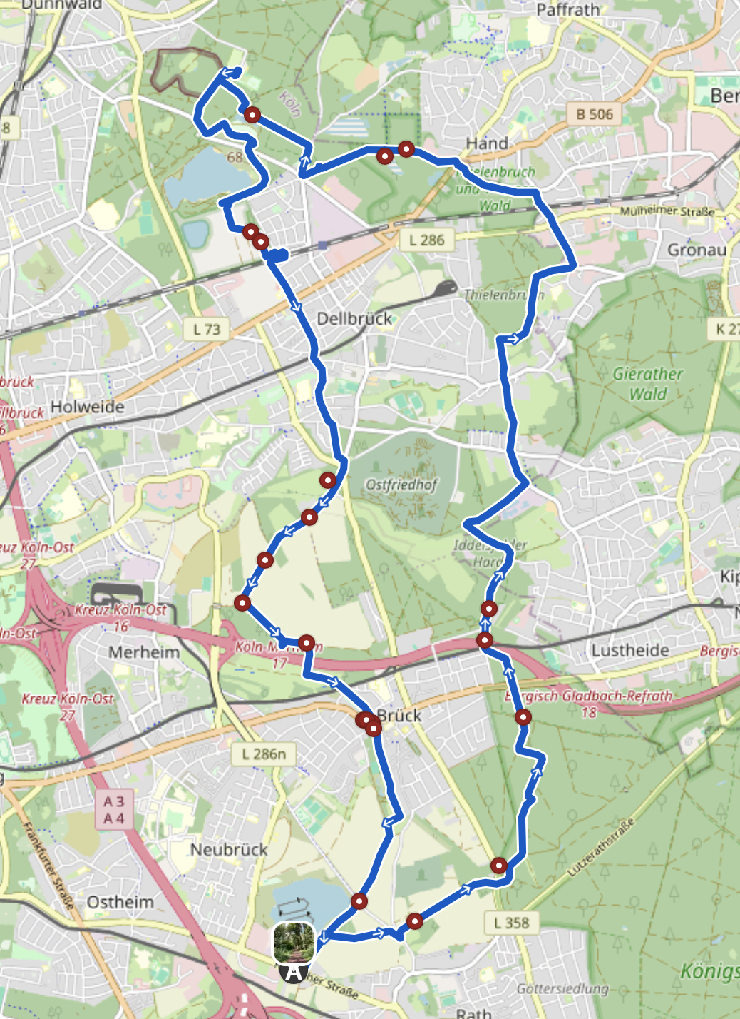 Ich habe mir also zwei der mit bikerouter.de geplanten, ins Wasser gefallenen und in Komoot geladene Strecken geschnappt und bin losgefahren. Die Karte oben zeigt das Endergebnis: Eine schöne Rundtour, die aus zwei verschiedenen Strecken zusammengesetzt wurde. Bikerouter bietet bis zu vier Alternativen an, aus denen ich wählen kann. Ich wählte also Hin: durch den Wald nach Dünnwald zurück über die Dörfer. Der Hinweg ist leicht nachbearbeitet, weil beide Systeme sich im Wesentlichen an der kürzesten Strecke orientieren, ich aber durch den Wald fahren wollte.