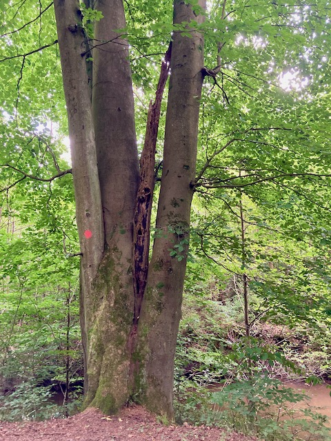 Dazu muss ich ein Bisschen an den Jungbuchen vorbei, den Hang runter.und so geländegängig bin ich gerade nicht am Hang. auch hier wächst hoffnungsvoll junger Mischwald.