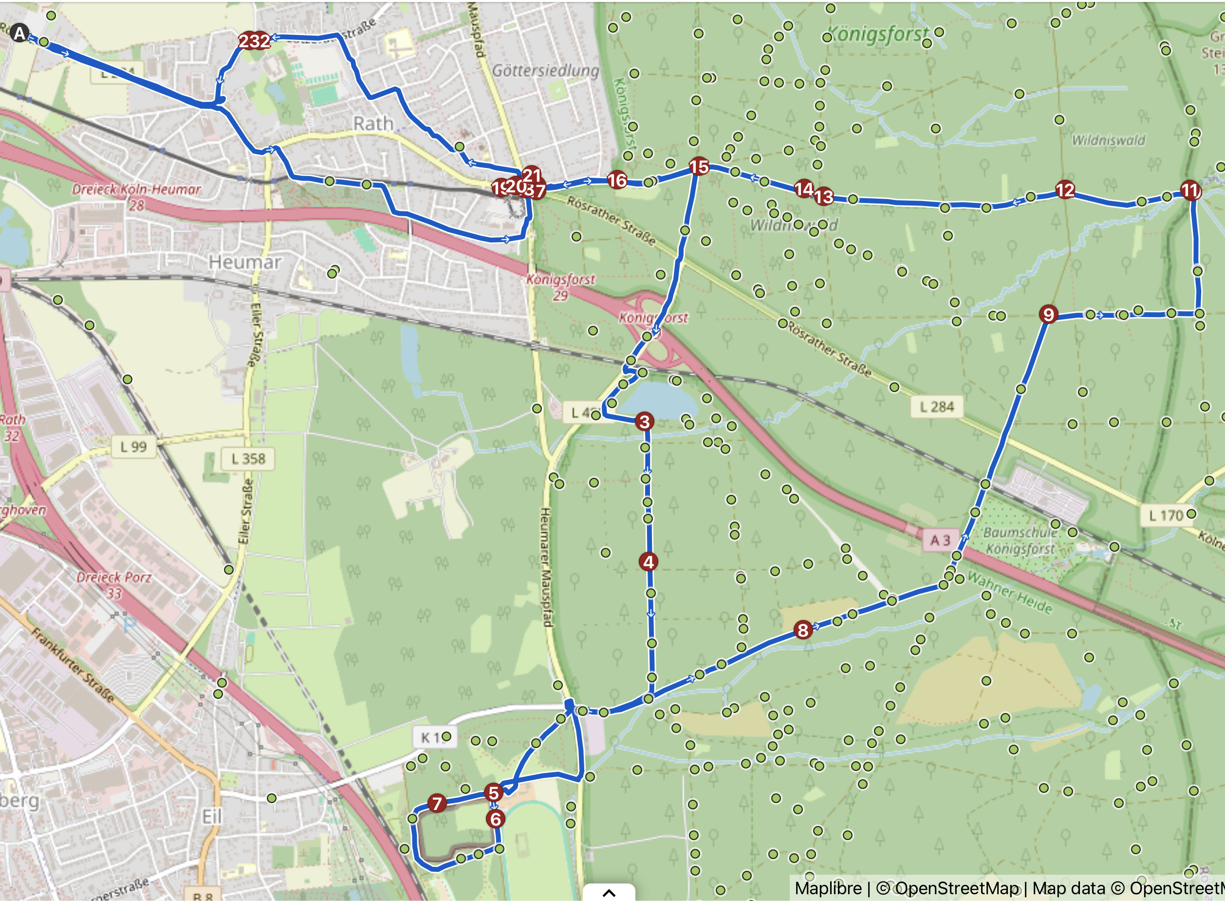 Die bekannte Strecke am Mauspfad entlang finde ich mittlerweile wegen des Verkehrsaufkommens nicht schön. Nach einem morgendlichen Zickenkrieg mit Komoot bei der Planung, erfolgte der Versuch, Gut Leidenhausen durch die Heide anzufahren. Die Waldstrecke war gut, und kürzer als ich dachte. Aber drei fiese Straßenüberquerungen hatten es in sich. Grengeler und Heumarer Mauspfad haben sich inzwischen zur stark befahrenen Rennstrecke entwickelt. Am Gut Leidenhausen ist es kaum noch möglich, den Mauspfad zu überqueren. Hier gehört dringend eine Ampelanlage für fußgänger und Radfahrer hin und auch für die Autos, die aus Porz kommend in die kleinste Lücke grätschen.
