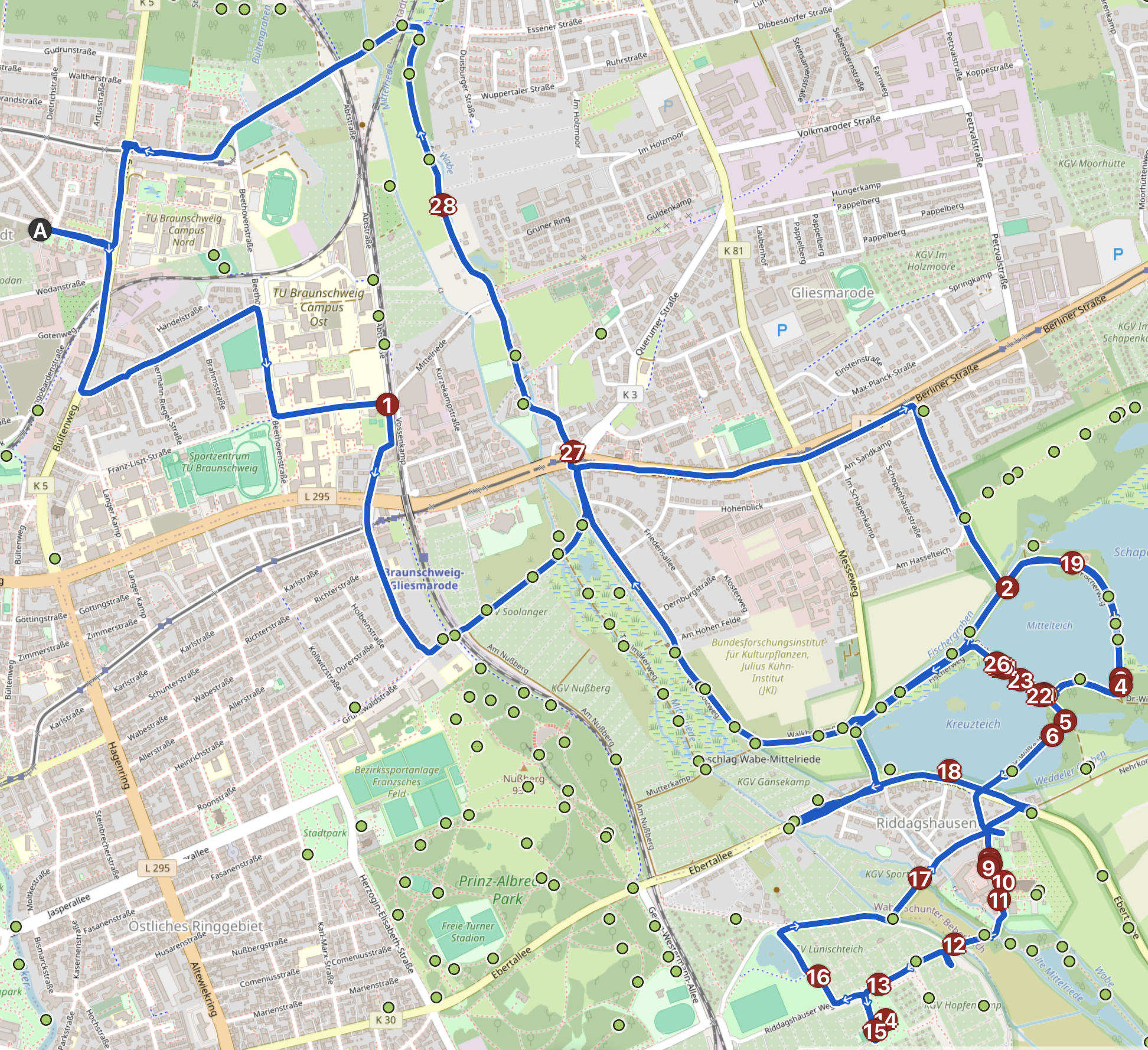Über Nebenstraßen, ein Stückchen Ringgleis und ein kleines Stück Hauptstraße, das ich mir wahrscheinlich selbst zuzuschreiben habe, weil ich an der Tour rumgefummelt habe, erreichte ich die Teichlandschaft von Riddagshausen.