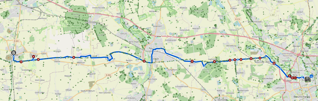 Ich fahre also ein Stückchen über Land, durch Woltorf, die Rampen zum Kanal runter sind zugewachsen, aber Hannover ist ausgeschildert – aber blöd ausgeschildert, nämlich auf verkehrsreichen Straßen 52km (??) rund um Peine . (Da hätte ich was essen sollen). Ich mache mal kurz den Flugmodus aus und befrage Komoot, wie ich wieder an den Kanal komme.