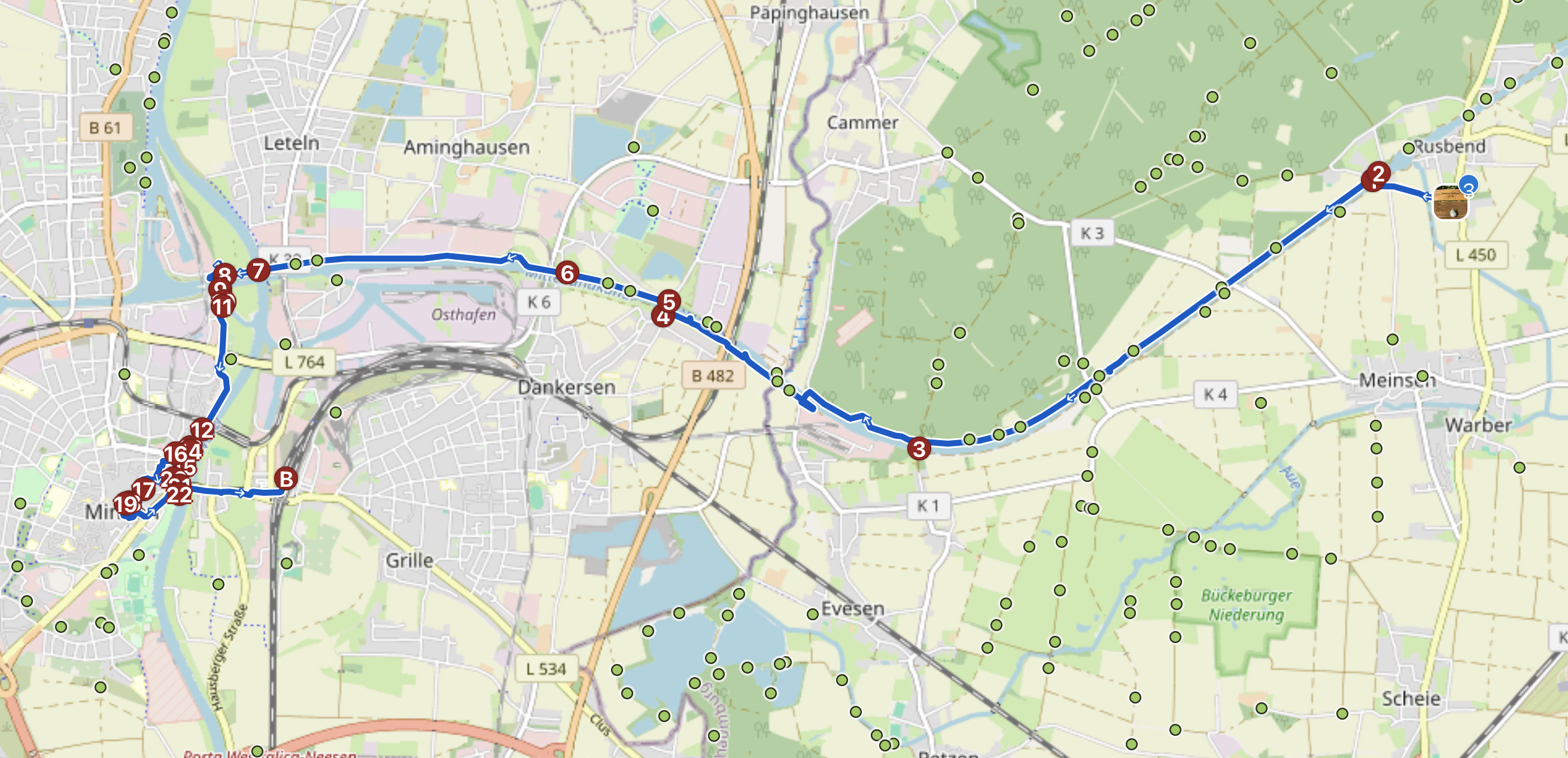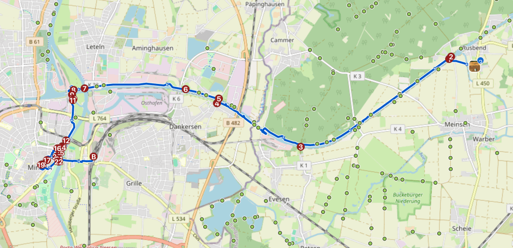 Nach dem Frühstück lasse ich ihn auf dem Rastplatz vom Vortag wieder frei. Nach Minden ist es nicht weit, aber trotzdem gut, dass ich früher angehalten habe, denn:
