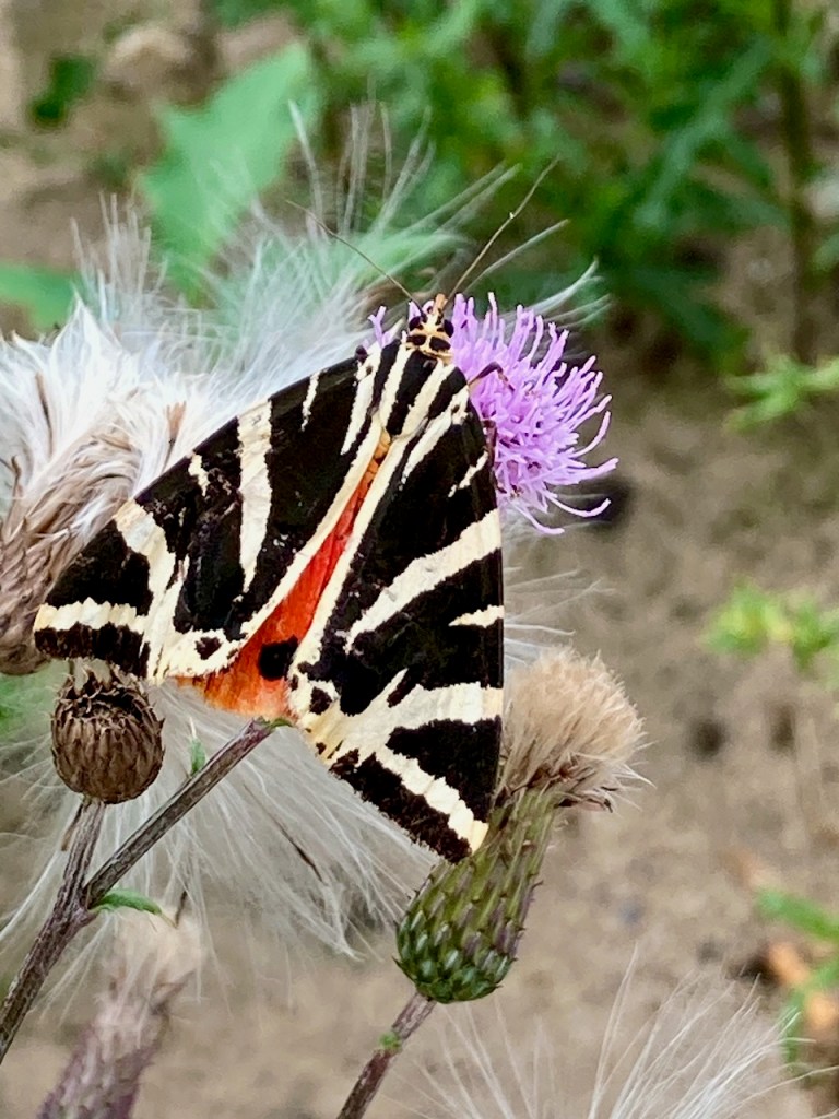 Was flattert den da? Das war eine unerwartete Begegnung mitten in der Stadt in Mülheim an der Ruhr. Die Spanische Flagge, auch russischer Bär genannt, ist mit ihren fast 5 cm schon ziemlich groß und auffällig. Mit ihrer auffälligen Färbung, vor allem den knallroten Unterflügeln, kann es sich der tagaktive Nachtfalter leisten, tagsüber herumzufliegen. Er demonstriert seine Ungenießbarkeit mit seiner auffälligen Färbung, vor allem den knallroten Unterflügeln, die plötzlich aufblitzen.