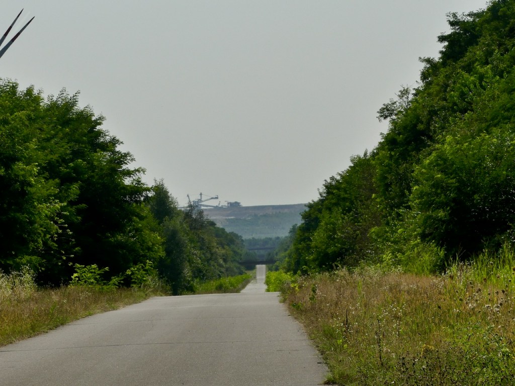 Dann bin ich plötzlich an der Erft. Die hatte ich zahmer in Erinnerung, war aber seit dem Hochwasser nicht mehr hier. Dann macht die Route einen scharfen Knick und geht dann breit und schnurgerade Richtung Tagebau.