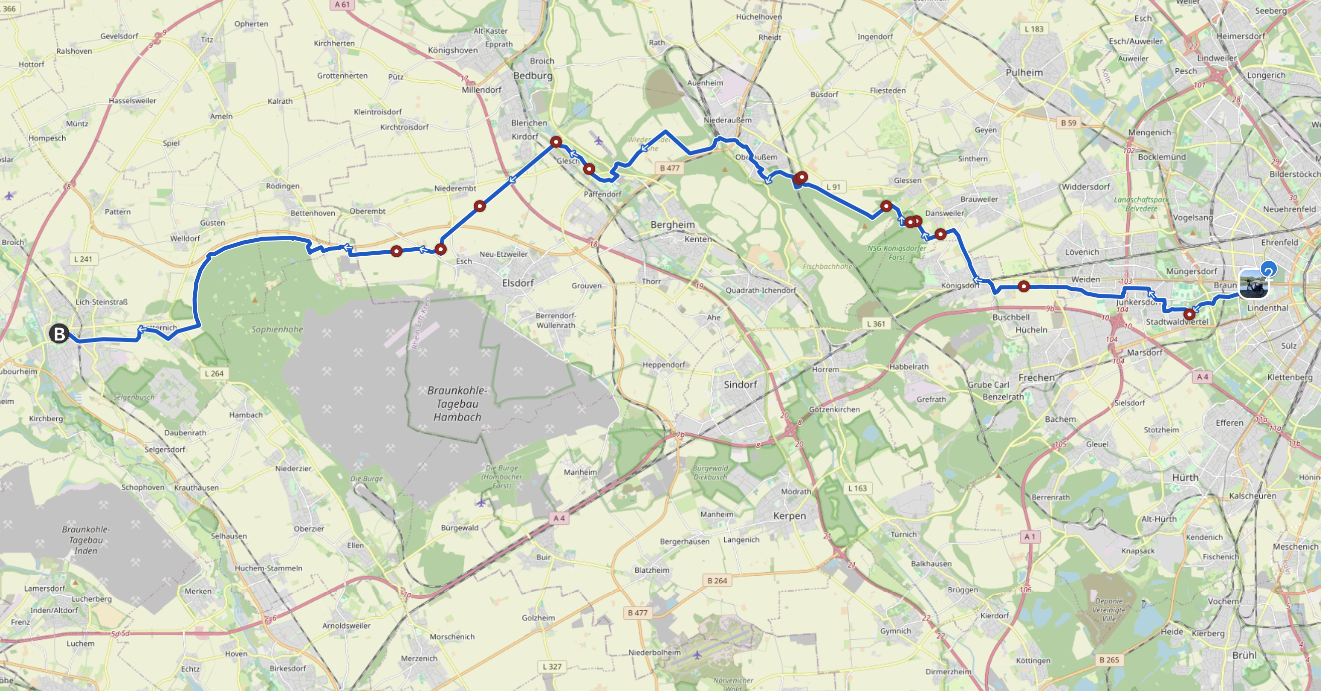 Bikerouter mit meinen Einstellungen führt autofrei Richtung Norden an Königsdorf vorbei, durch den Königsdorfer Forst und um die Glessener Höhe herum.