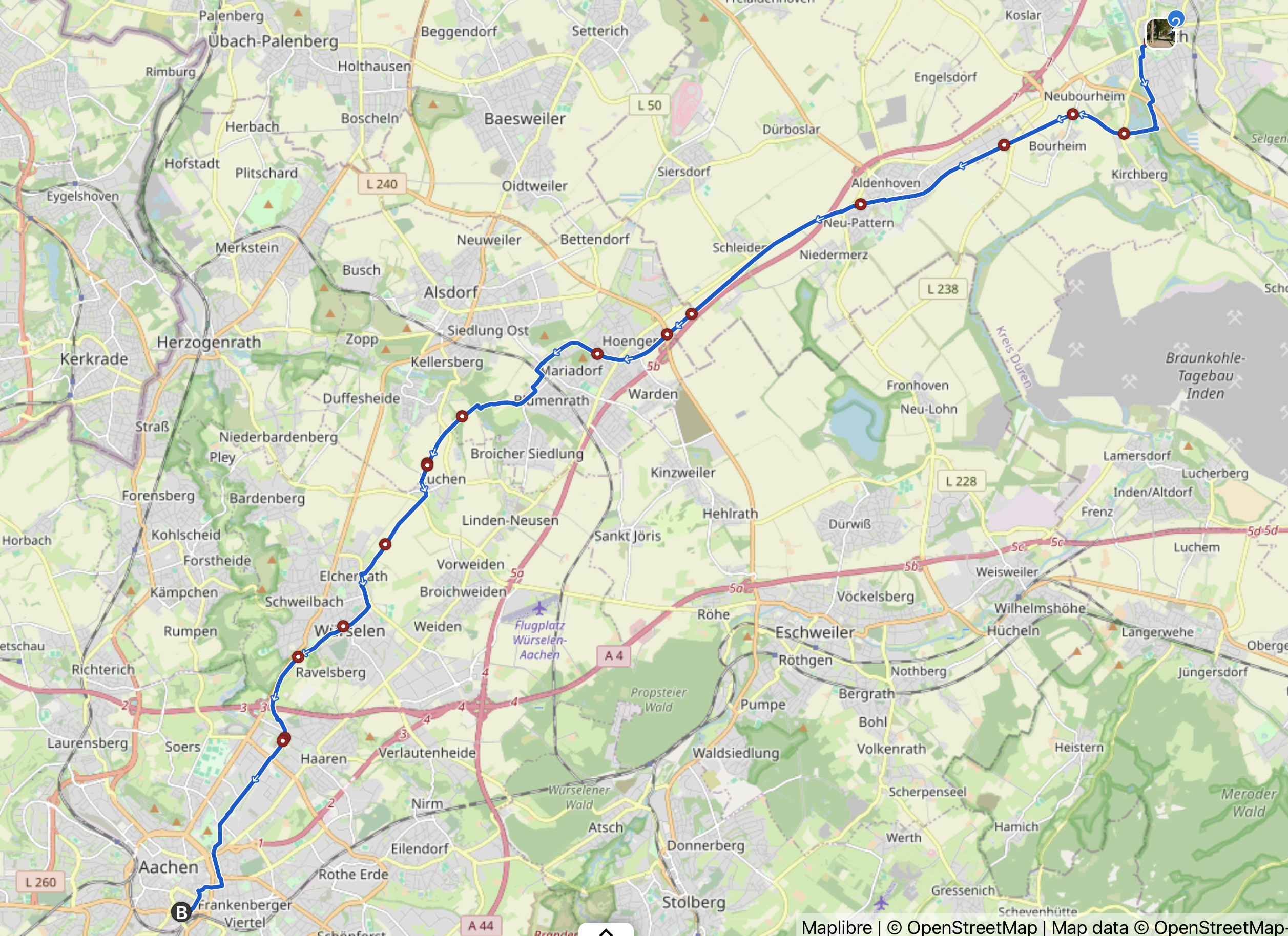 Aber jetzt wieder! Dieses Mal habe ich den bikerouter.de mal machen lassen und mir geschworen, nicht dran rumzufummeln. 1. Vorschlag: Über Düren, 1. Alternative über Jülich, aber irgendwie anders. Jülich mag ich lieber.