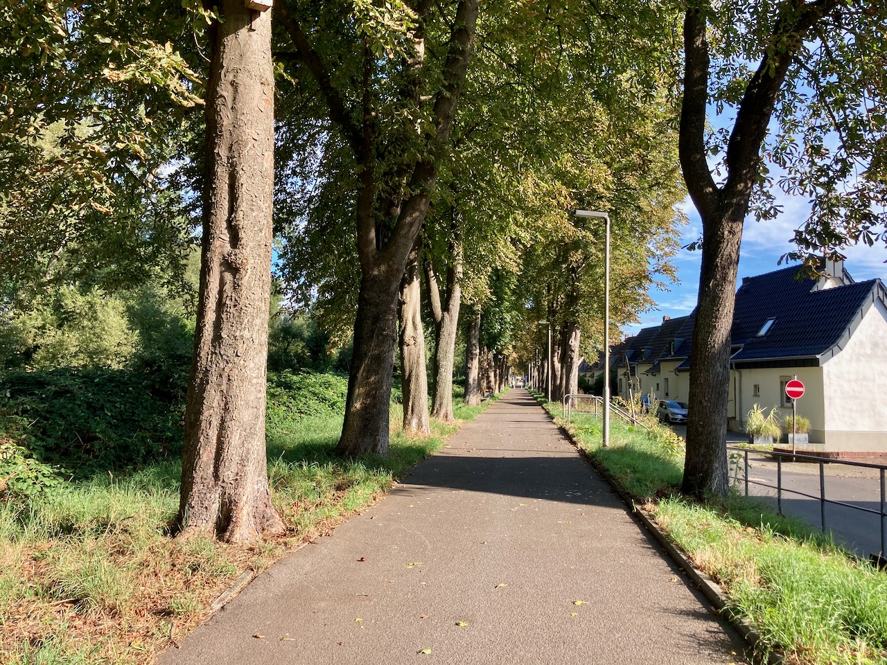 Weil die 9 rappelvoll ist, steige ich um in die 1 fahre ein Stück durch den Grüngürtel, und steige dann am Adenauer-Weiher quer in die geplante Tour ein.