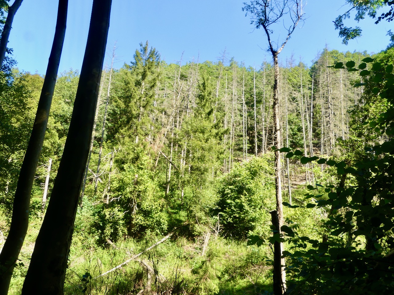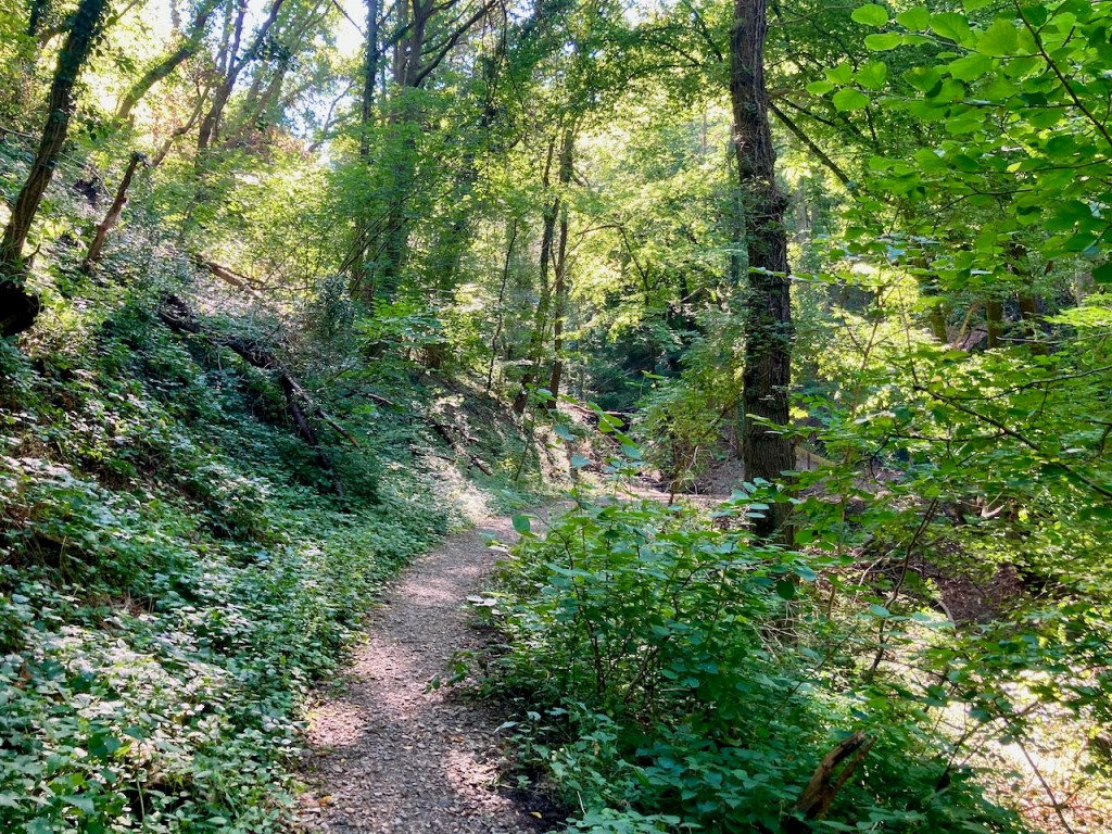 Dort sehe ich einen Hinweis auf den „Wildnisweg“ und tauche ein in den Wald.