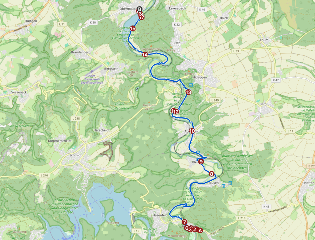 durch den Wald am Staubecken Obermaubach, und in Obermaubach finde ich ein schönes Zimmer. Den Rest des Tages hänge ich am Staubecken und im Biergarten Strepp am See ab, und lese mein Buch fast aus.