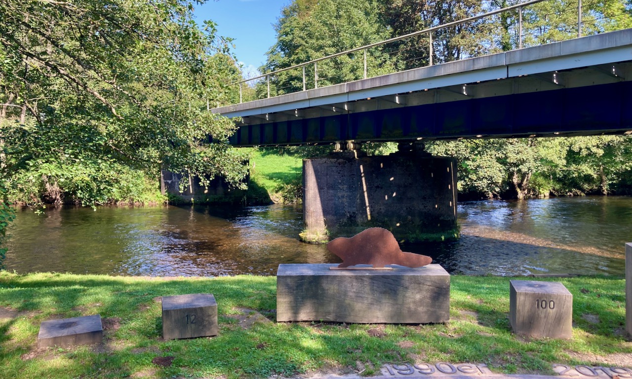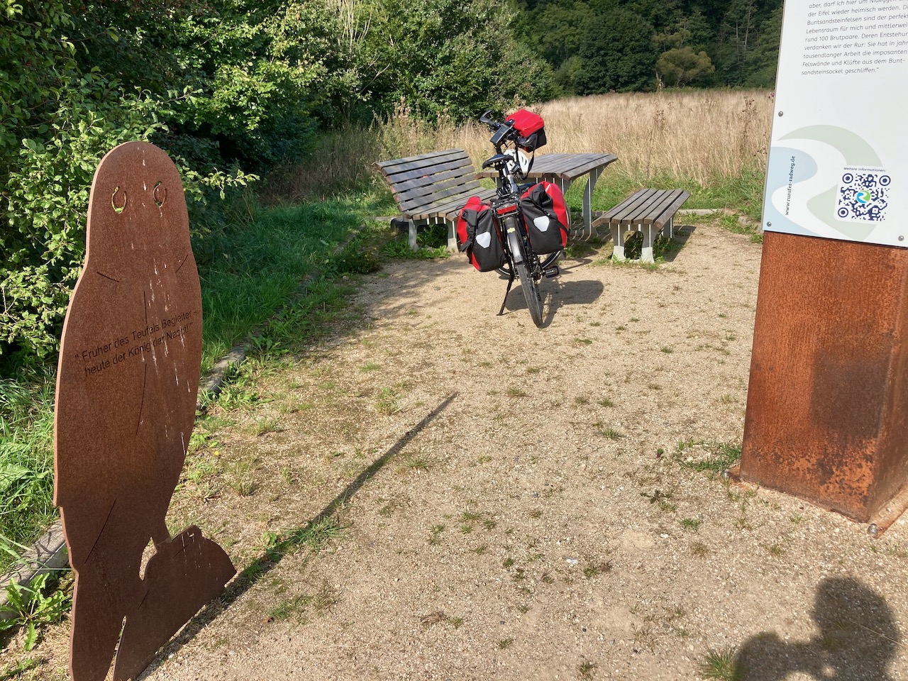 Dieser Teil des Rurtalradwegs ist mir bekannt – zu bekannt. Erst Straße, dann der blöde Hügel hinter Hausen, der am Ende mit einem Rastplatz und Blick auf die Buntsandsteine belohnt wird – Pause – runter nach Blens, wieder Straße, in Abenden habe ich mal übernachtet, oha! ein neuer Rastplatz.