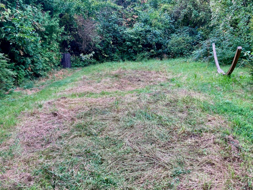 Seit Ende Juni immer ein Stückchen, angefangen mit den hohen Gräsern. Gestern fiel der letzte Halm, im Mittelteil hauptsächlich Sumpf-Hornklee und etwas Mayoran, alles abgeblüht. War nicht so hoch, aber immer noch zu nass und die langen Triebe des Hornklees wickeln sich um die Messer und verstopfen den Mäher. Gestern war es etwas trockener, da ging es besser. Gaaanz langsam gemäht, damit die kleinen Kröten weghopsen konnten. Warum sich jetzt hinten eine Kuhle gebildet hat, weiß der Geier. Ich habe mich trotz des Eigenantriebs ein paarmal festgefahren.