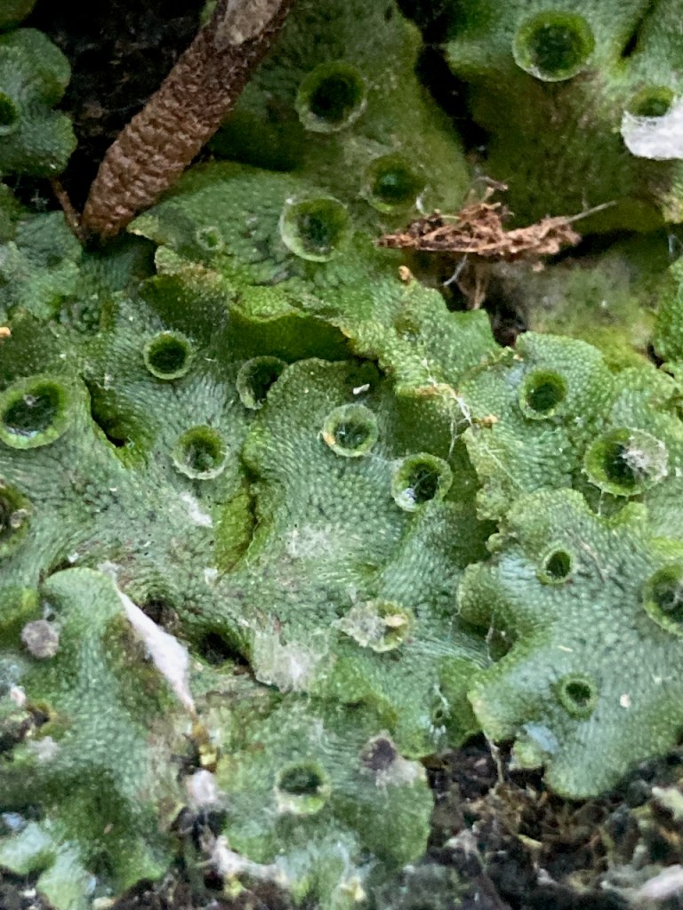 Aus dem Bioladen habe ich einen Rosmarin mitgebracht – und im Topf noch etwas grünes, schleimiges. Alge? Flechte? Moos! Aber welches? Ein Lebermoos, aber welches? Beim vorletzten Treffen in Löhne habe ich einen ganzen Haufen Naturführer abgegriffen unter anderem Flechten, Farne, Moose. Damit war ich bei irgendso ein Beckenmoos, aber jetzt bin ich nicht mehr so sicher. Noch mal gefragt: amtliches Endergebnis: gemeines Brunnenlebermoos, passt auch zum Topf.