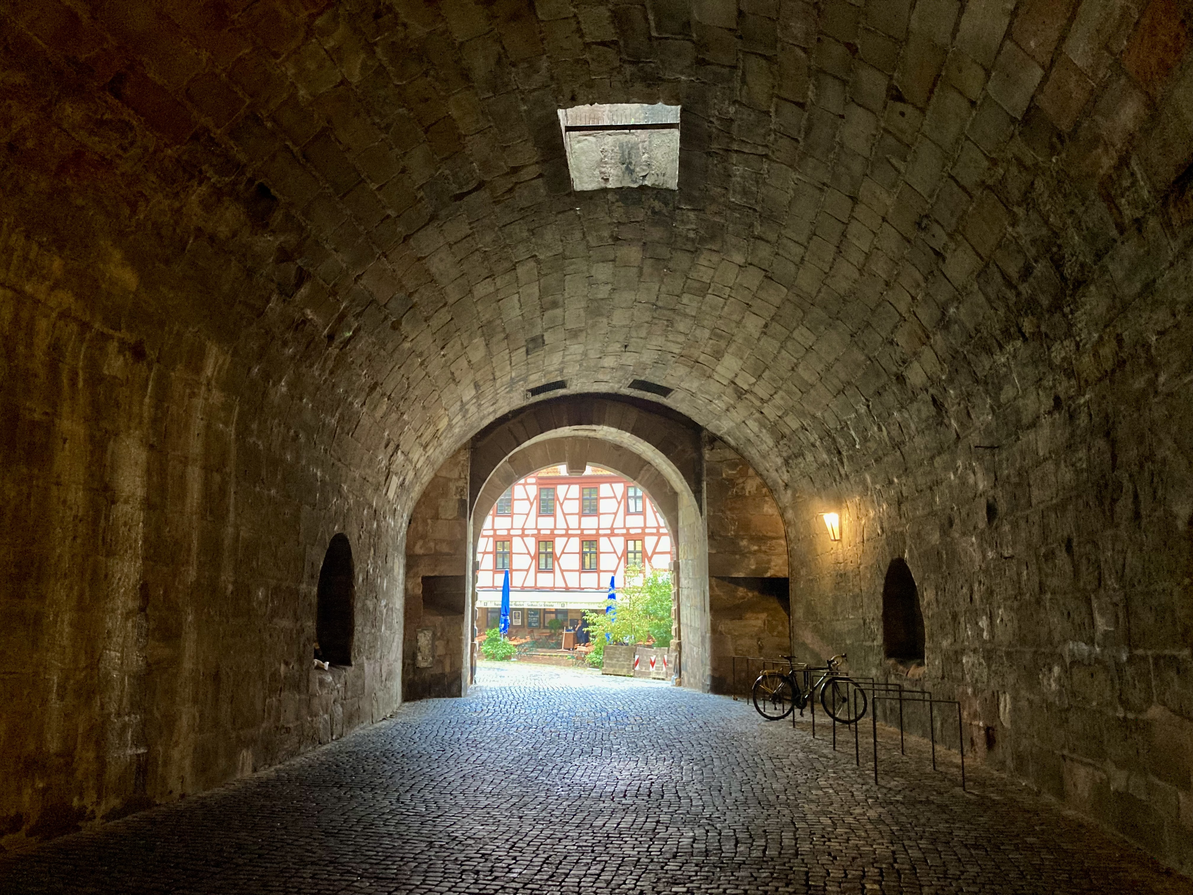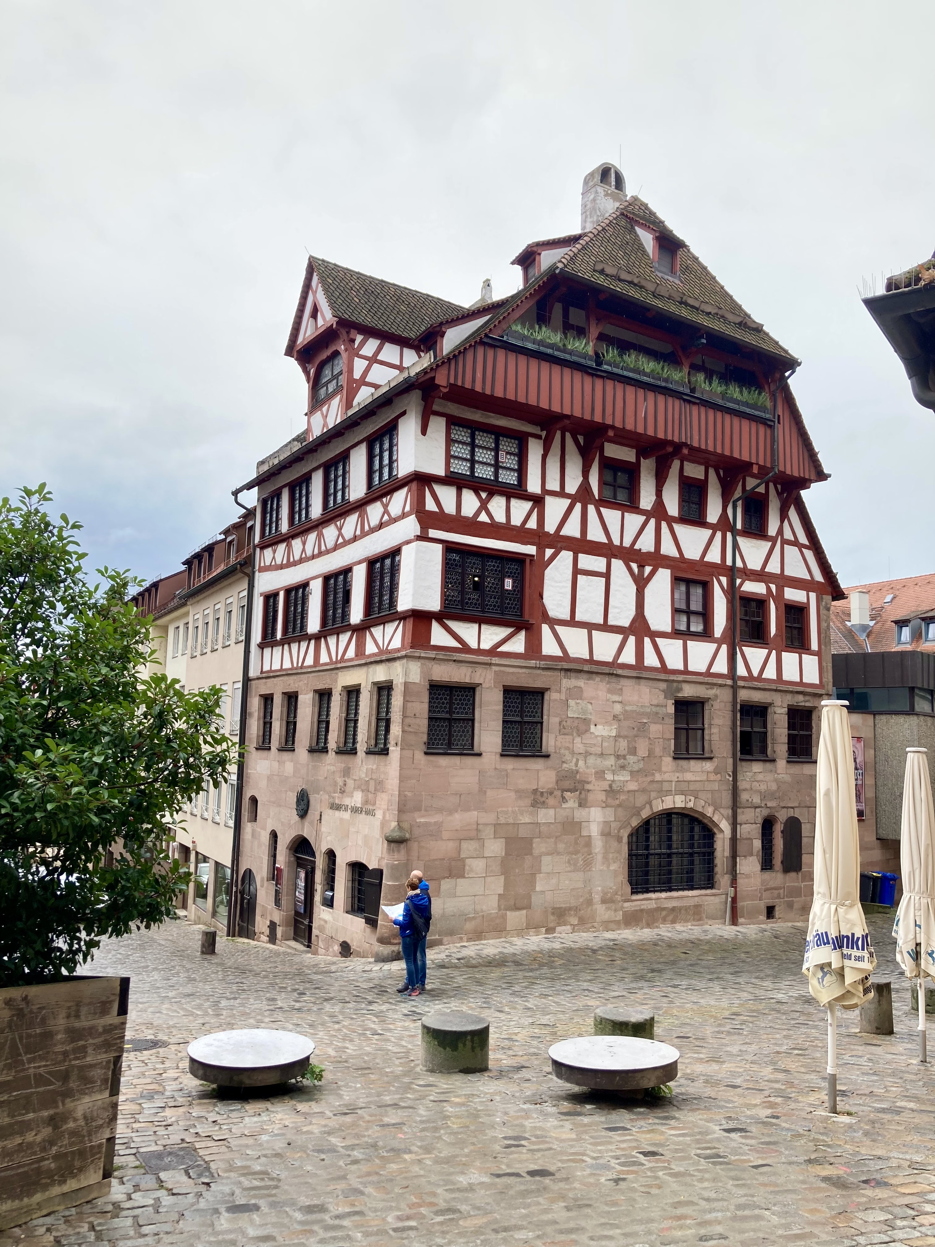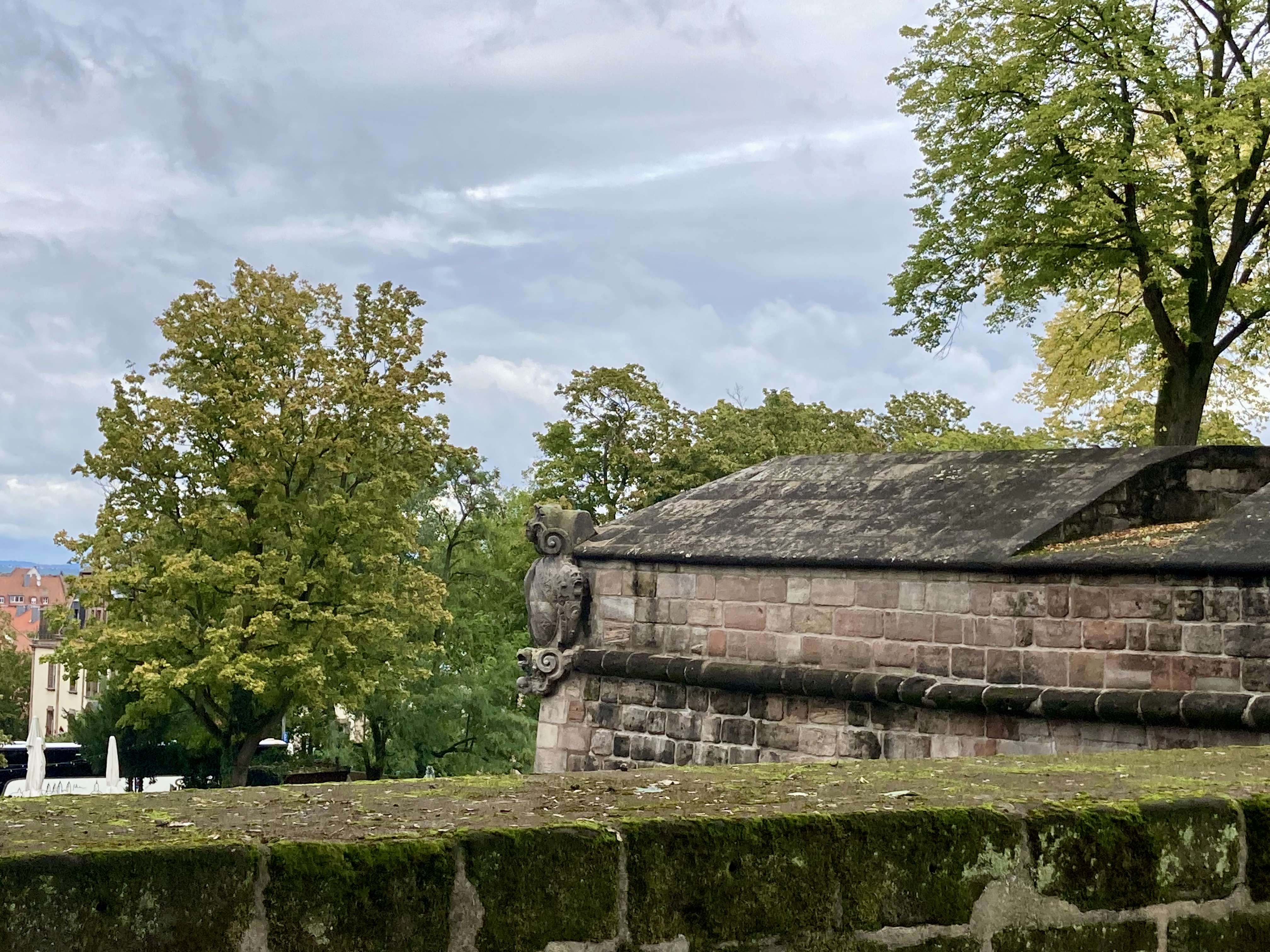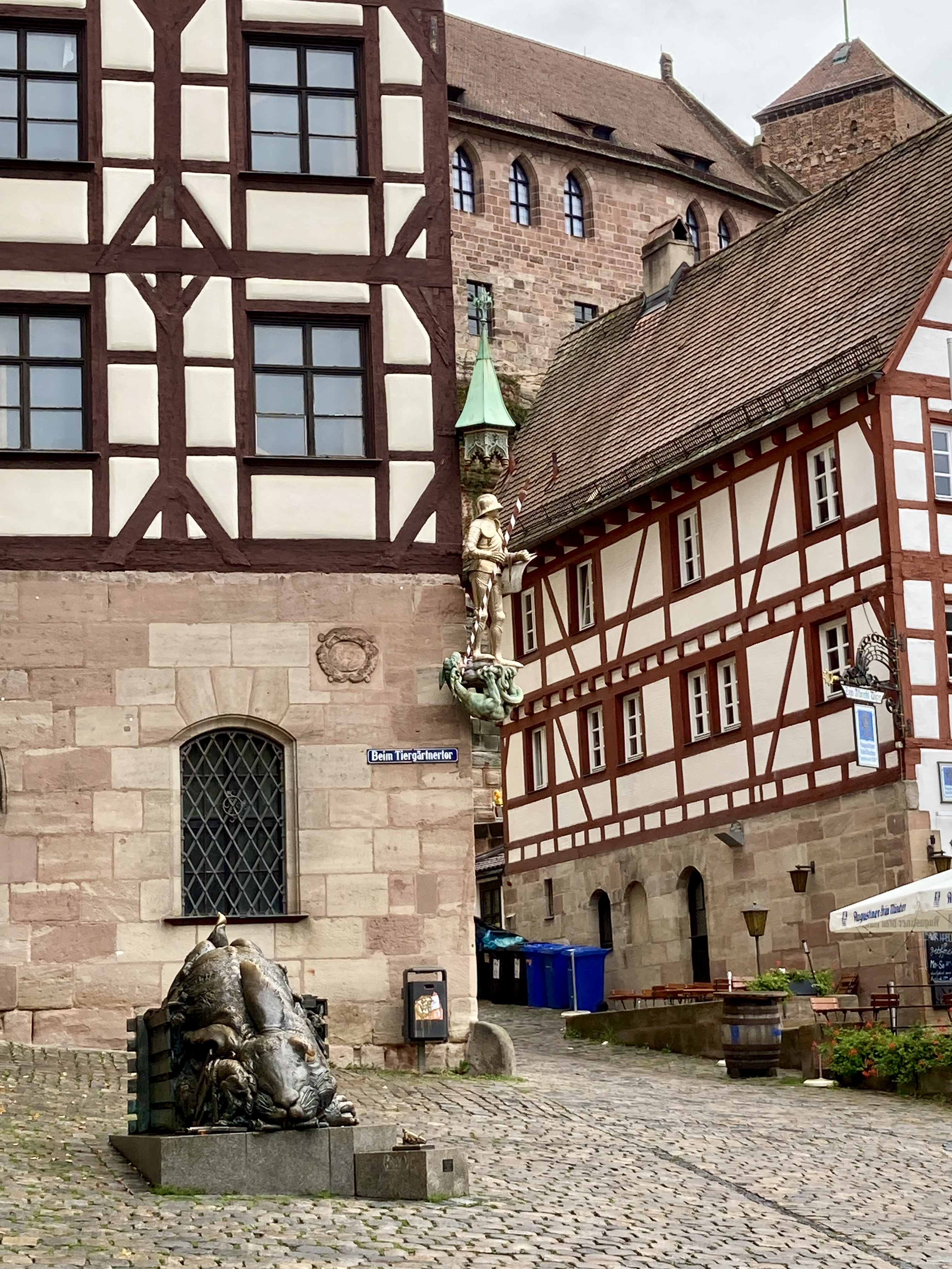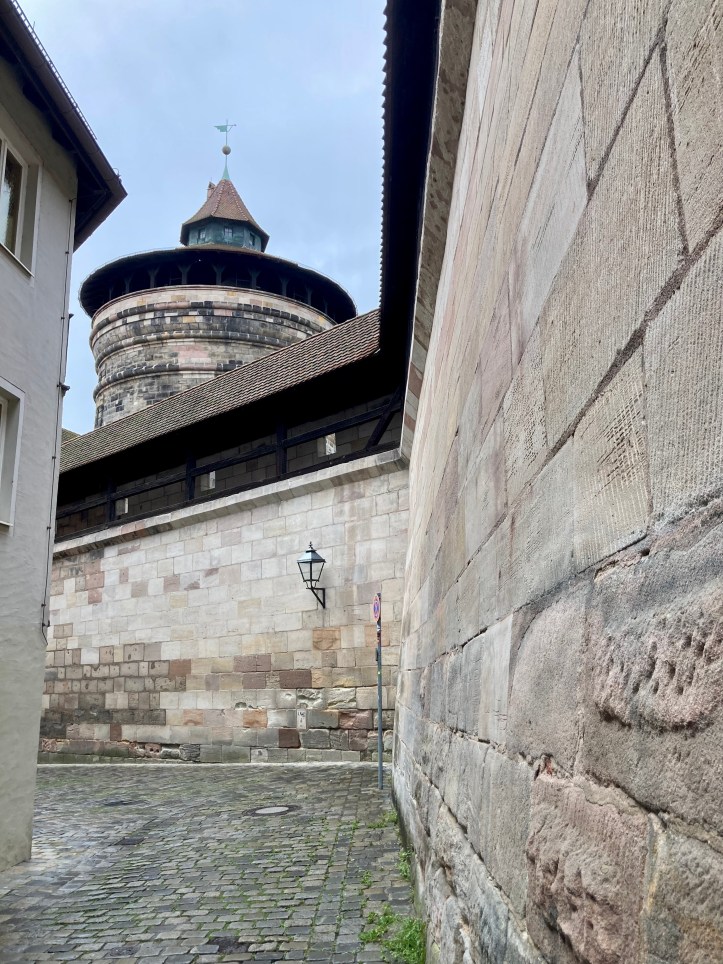 Gerade als es im Albrecht-Dürer-Haus richtig voll wurde, war ich schon wieder draußen. Habe dann noch ein wenig die Gegend erkundet. Der „Hase nach Dürer“ sieht etwas mitgenommen aus. Innsgesamt ein schönes Sück altstadt. Zum Schloss hoch war mir zu steil, also erstmal an der Wand lang..