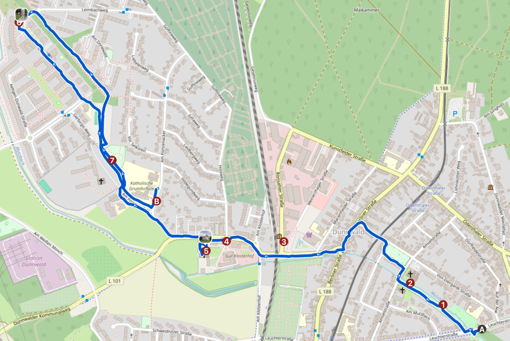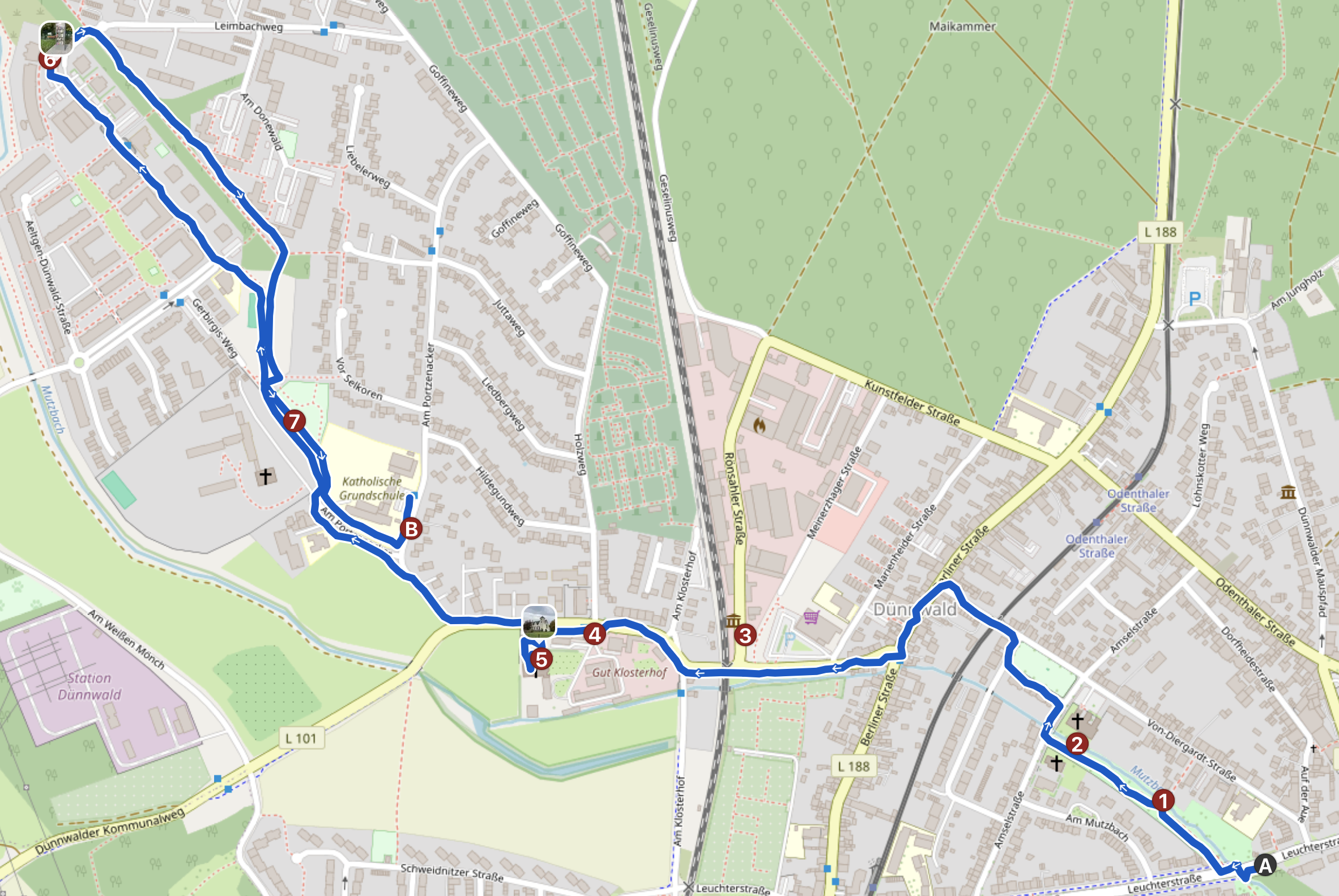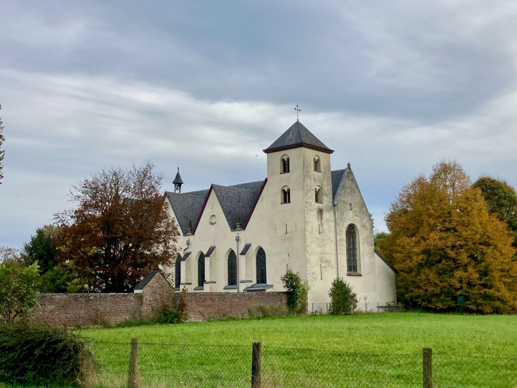 Zunächst folgte ich dem Mutzbach. Der fließt für mich gefühlt in die falsche Richtung, nämlich nach Nordwesten, während die Bäche im Königsforst nach Südwesten verlaufen. Des Rätsels Lösung: Er mündet bei Leverkusen in die Dhünn. Weiter geht es über die Prämonstratenserstraße zum ehemaligen Kloster, der Prämonstratenserinnen. Das ist inzwischen als Gutshof in Privatbesitz und nicht zu besichtigen. Die ehemalige Stiftskirche St. Nikolaus ist aber noch als Pfarrkirche in Gebrauch.