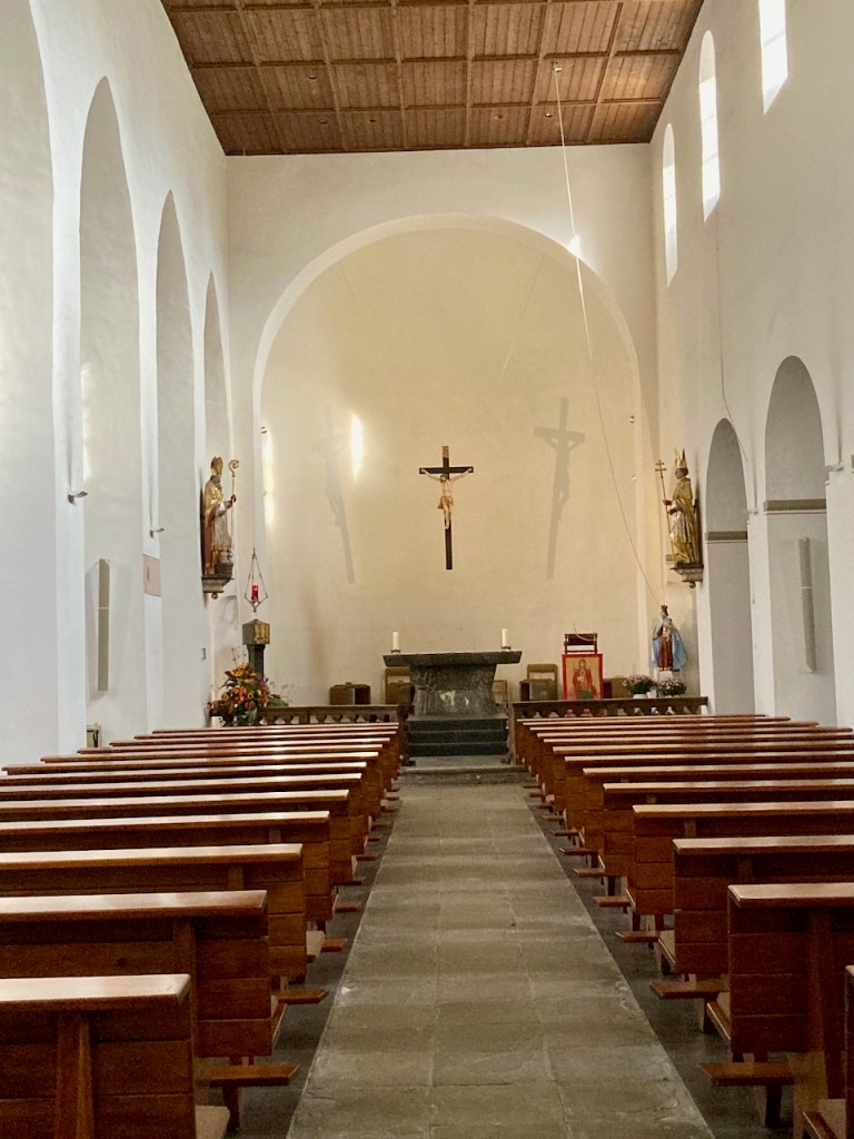 Innen ist die Kirche schlicht gehalten. Das Kreuz im Altarraum ist so gehängt und beleuchtet, dass neben dem gekreuzigten Jesus noch die beiden anderen Gekreuzigten erscheinen.