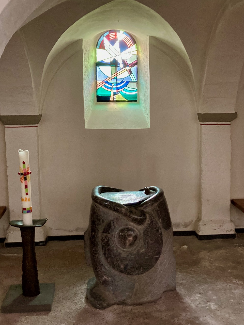 Das Taufbecken und auch den Altar hat der Bildhauer Eduard Schmitz etwa um 1955 gestaltet, der von Ernst Barlach beeinflusst war. Die Muttergottes mit Kind stammt aus dem 16. Jahrhundert.