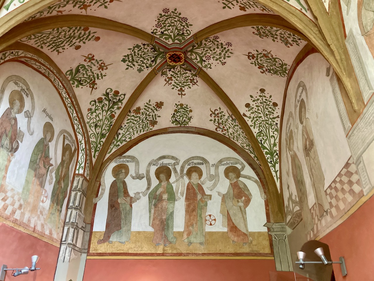 Beeindruckend fand ich die gotische Kapelle im Anbau. In der heutigen Sakristeimit dem Kreuzrippengewölbe ist einer der seltenen Malereizyklen des 15. Jahrhunderts weitgehend erhalten geblieben. Der Raum enthält unter anderem Darstellungen der Verkündigung, der 12 Apostel und der heiligen Sippe.