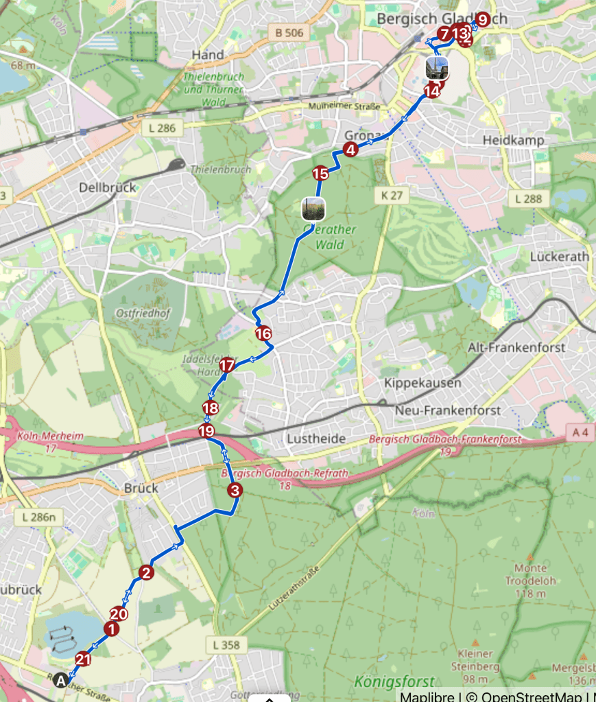 Nachdem ich Refrath knapp gestreift habe, bin ich schon wieder im Wald. Diesmal der Gierather Wald, den ich durchquere. Über einen ehemaligen Bahndamm fahre ich in Bergisch Gladbach ein. Ein Stück stark befahrene Hauptstraße bleibt mir nicht erspart. Dann kommt das hinzugefügte Strecken-Highlight.