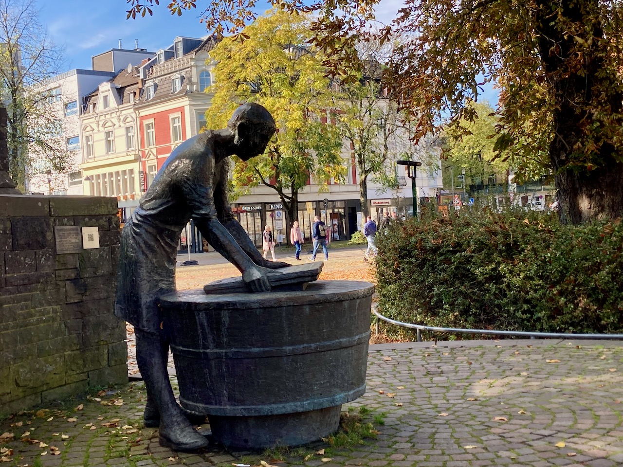 Mir fallen zwei fast lebensgroße Denkmale auf: Links geht ein Papierschöpfer seiner Arbeit nach, rechts bietet der Hexe Köbes eine Narrenkappe und eine Krone an..