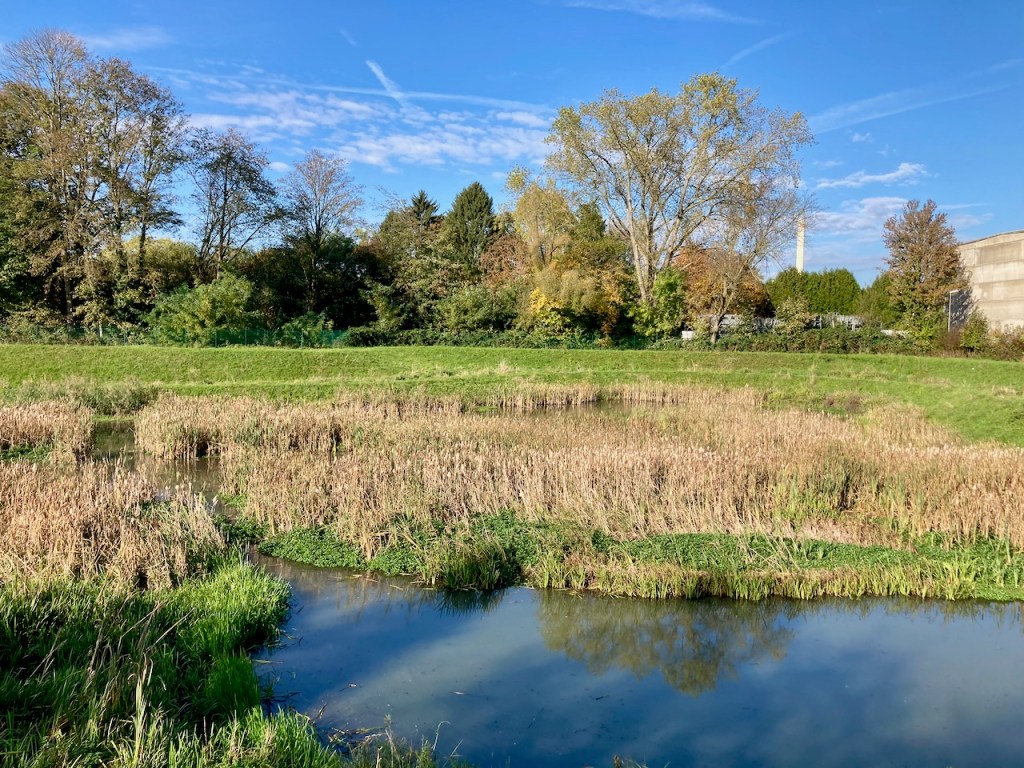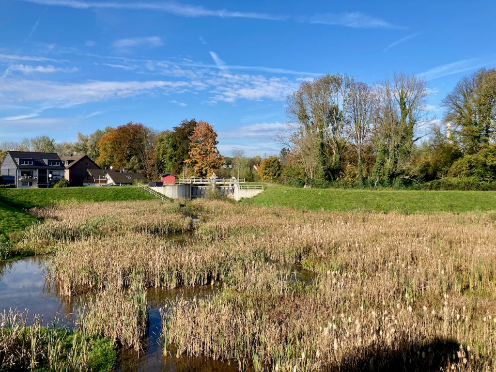 Auf dem Rückweg schaue ich mir noch das Rückhaltebecken genauer an. War das schon immer hier? Seltsam. Wieder zu Hause habe ich ein Bisschen recherchiert. Ab 2017 wurde in einem Großprojekt „Strunde hoch 4“ die Strunde aus der Kanalisation nach oben geholt und gleichzeitig der Hochwasserschutz verbessert. Kein Wunder also, dass ich bei meinen frühen Touren ihren Lauf in Bergisch Gladbach verloren habe.