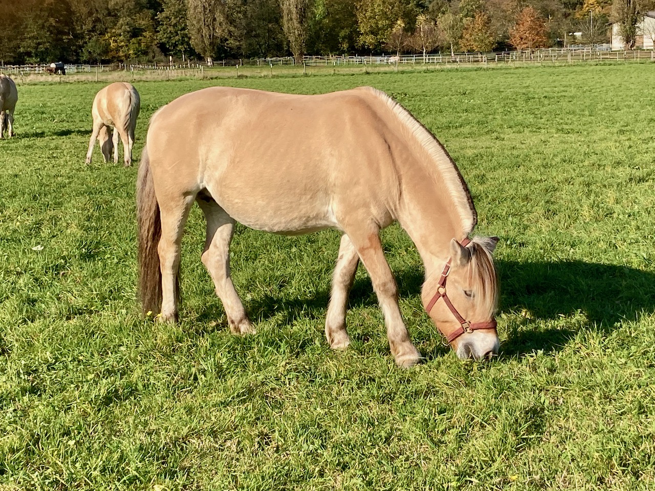 Als ich aus dem Wald wieder auftauche, wird gerade eine Herde Fjordpferde vom Gestüt auf die Weide getrieben.