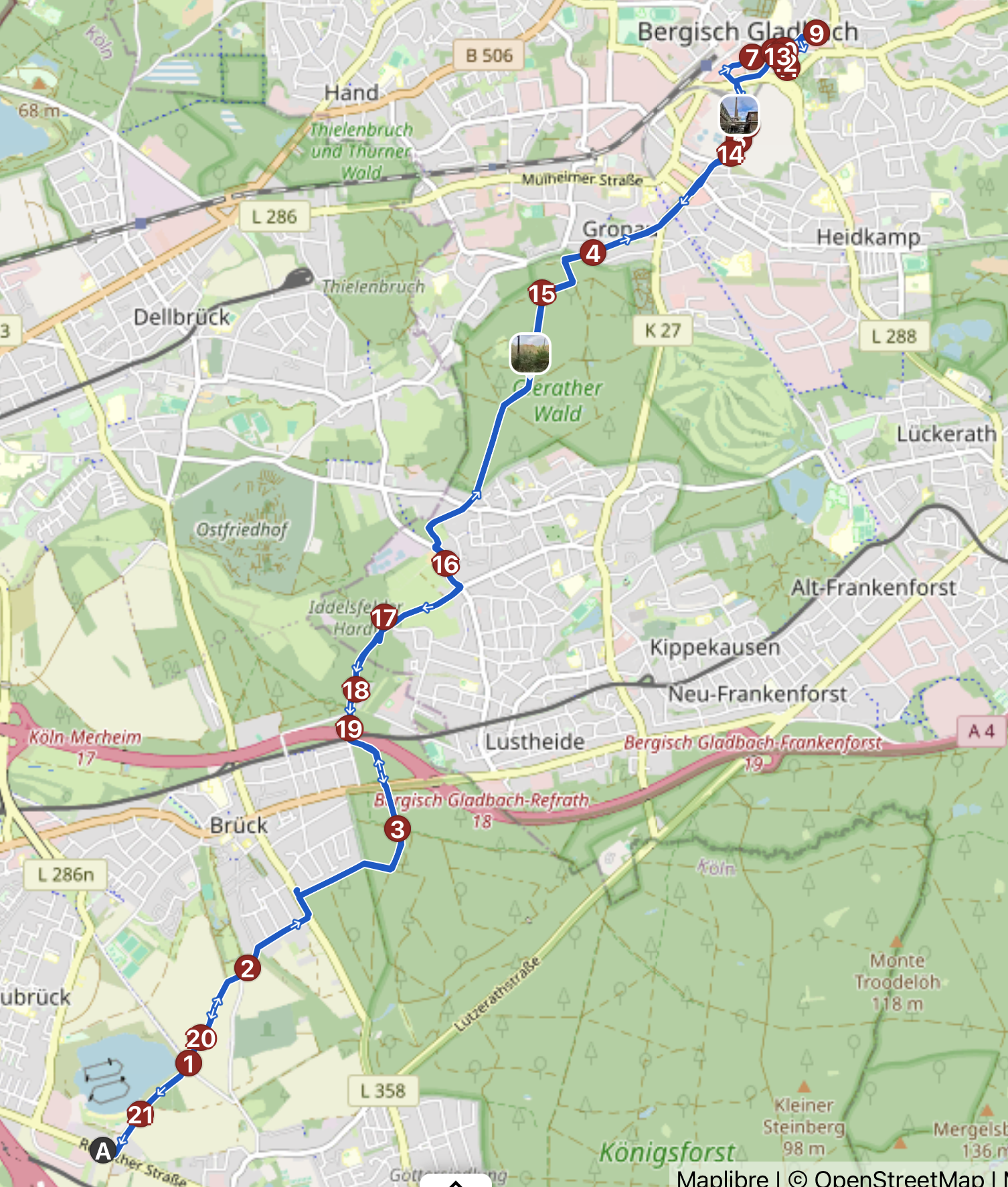 Nachdem ich Refrath knapp gestreift habe, bin ich schon wieder im Wald. Diesmal der Gierather Wald, den ich durchquere. Über einen ehemaligen Bahndamm fahre ich in Bergisch Gladbach ein. Ein Stück stark befahrene Hauptstraße bleibt mir nicht erspart. Dann kommt das hinzugefügte Strecken-Highlight.
