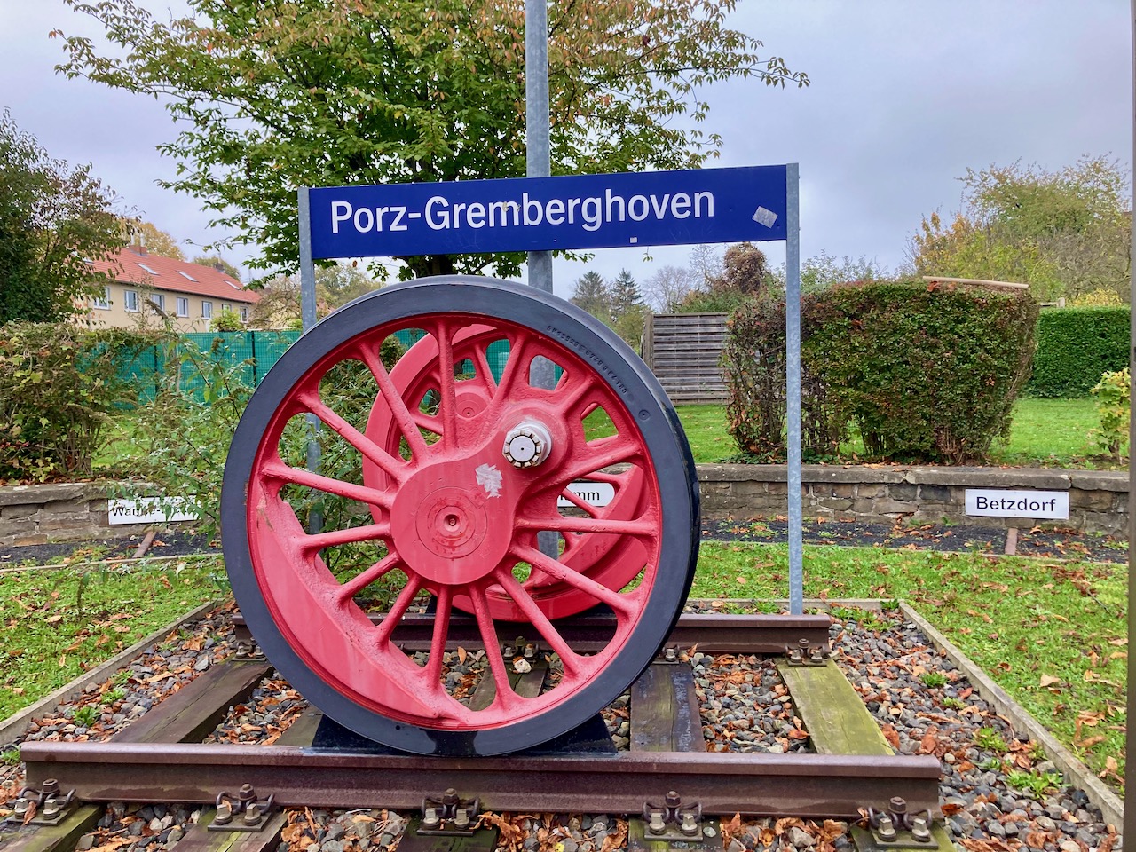 Ebenfalls am Bahnhofplatz: Die Achse einer Eisenbahn als Denkmal, das an den ehemaligen Bahnhof erinnert. Das ist nicht nur ein Teil des Kulturpfades Porz, sondern auch der Via Industrialis, die verschiedene Industriedenkmale verbindet. Leider auch dieser schöne Ort von vorne komplett zugeparkt.