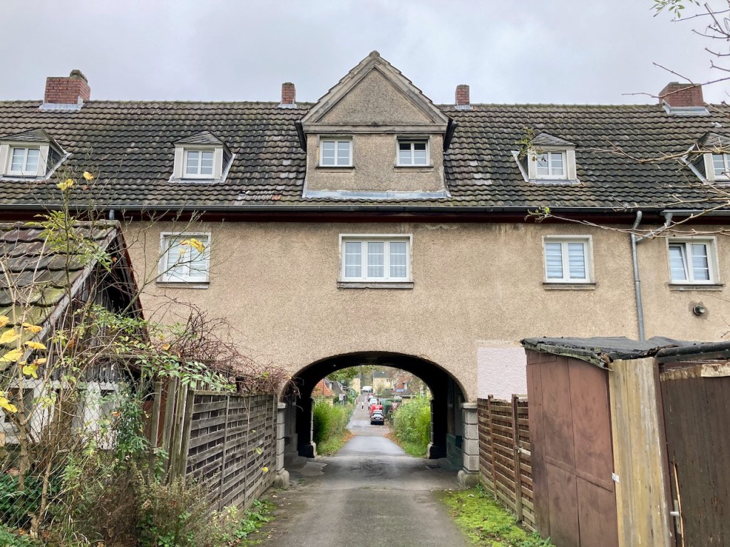 Der Kern der Siedlung war als Oval angelegt und ist in der Form weitgehend erhalten. Das Torhaus verbindet Die Siedlung mit den Gärten der Mieter. Hier sieht man das gut von oben.