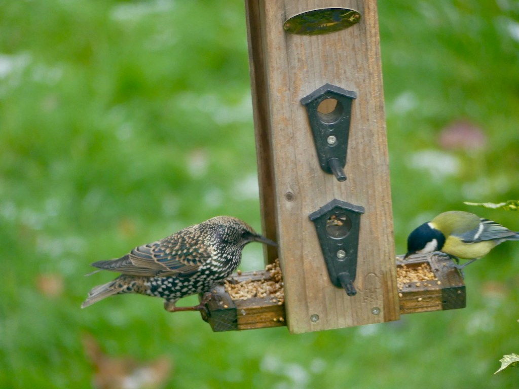 Im Winter verzichtet der Star auf seinen feschen Metallic-Look und trägt stattdessen weiße Tupfen. Vorgestern kam ein Schwarm eingeflogen und gleich wieder weg. So schnell konnte ich gar nicht die Kamera greifen. Nur die mutigen kamen zurück, um einen Happen zu nehmen.