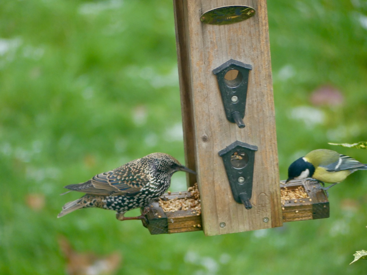 Im Winter verzichtet der Star auf seinen feschen Metallic-Look und trägt stattdessen weiße Tupfen. Vorgestern kam ein Schwarm eingeflogen und gleich wieder weg. So schnell konnte ich gar nicht die Kamera greifen. Nur die mutigen kamen zurück, um einen Happen zu nehmen.