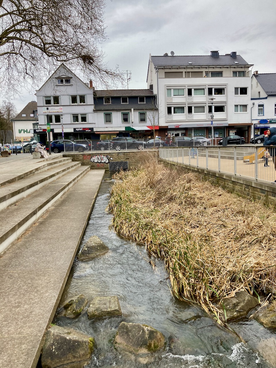 Hier finde ich auch die Strunde wieder, deren Lauf ich immer in Bergisch Gladbach verloren habe. Auf der Lauschtour erfahre ich, dass ihr Lauf unter Wellenlinien im Pflaster der Fußgängerzone verborgen ist. Da konnte ich ja lange suchen