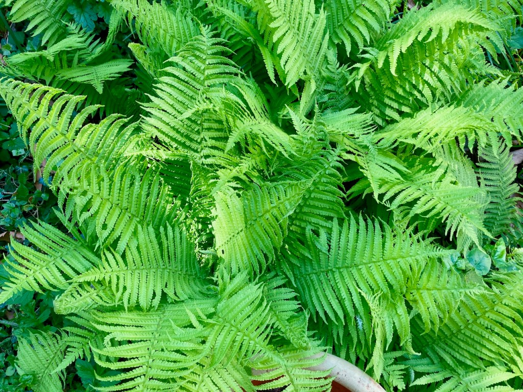 Womit ich nicht gerechnet hatte ist der Farn. Da gab es immer ein paar kümmerliche Pflanzen im Vorgarten, die auch schon beim ersten Anzeichen von Wärme und Trockenheit braun verschrumpelt den Geist aufgaben. Freitag früh noch kein Farn in Sicht und Gestern: