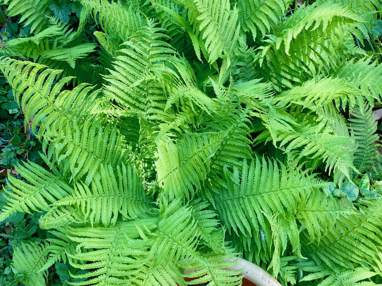Womit ich nicht gerechnet hatte ist der Farn. Da gab es immer ein paar kümmerliche Pflanzen im Vorgarten, die auch schon beim ersten Anzeichen von Wärme und Trockenheit braun verschrumpelt den Geist aufgaben. Freitag früh noch kein Farn in Sicht und Gestern: