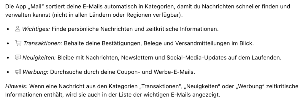 Ich schaue genauer hin: Es gibt jetzt bunte Schuber über dem Eingangsfach: Kategorien! Wichtiges, Transaktionen, Neuigkeiten, Werbung.
