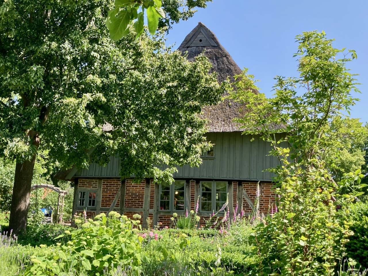 Die Dunkersche Kate ist ein Fachwerkhaus aus dem 17. Jahrhundert. Früher diente sie Schmieden, Leinenwebern und Bauern als Wohn- und Arbeitsstätte. Heute zählt sie neben Kirchen und Schlössern zu den beliebten Ausflugszielen auf dem schleswig-holsteinischen Land. Innen fand gerade ein Kunsthandwerkermarkt statt, hinter der Kate gibt es noch einen hübschen Bauerngarten mit Bienenhaus und Backhaus.