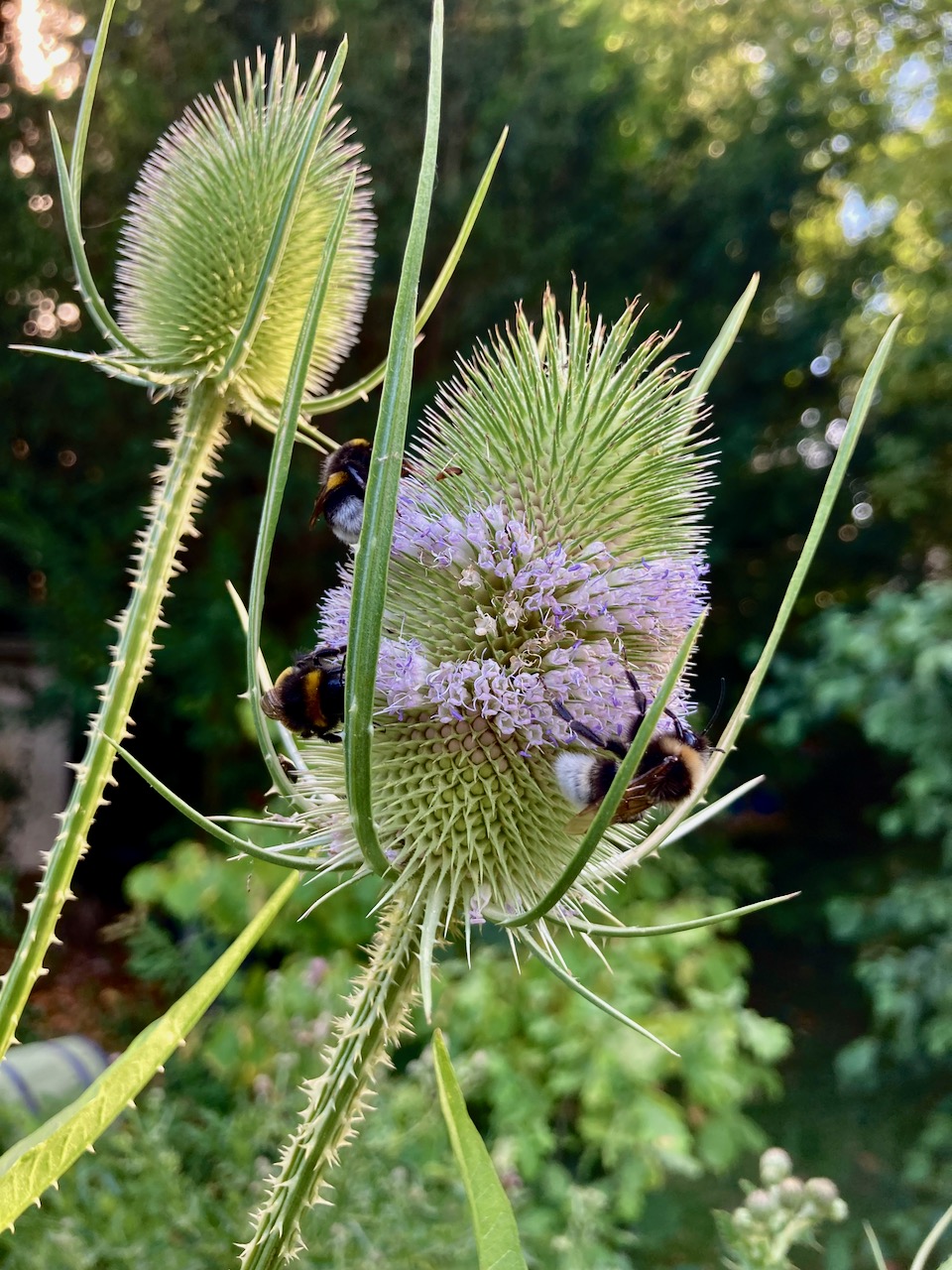 Die Wilde Karde ist zweijährig. Nachdem sich wie geplant die große Blattrosette ausgebildet hatte, habe ich in diesem Jahr noch eine weitere mitgebracht.