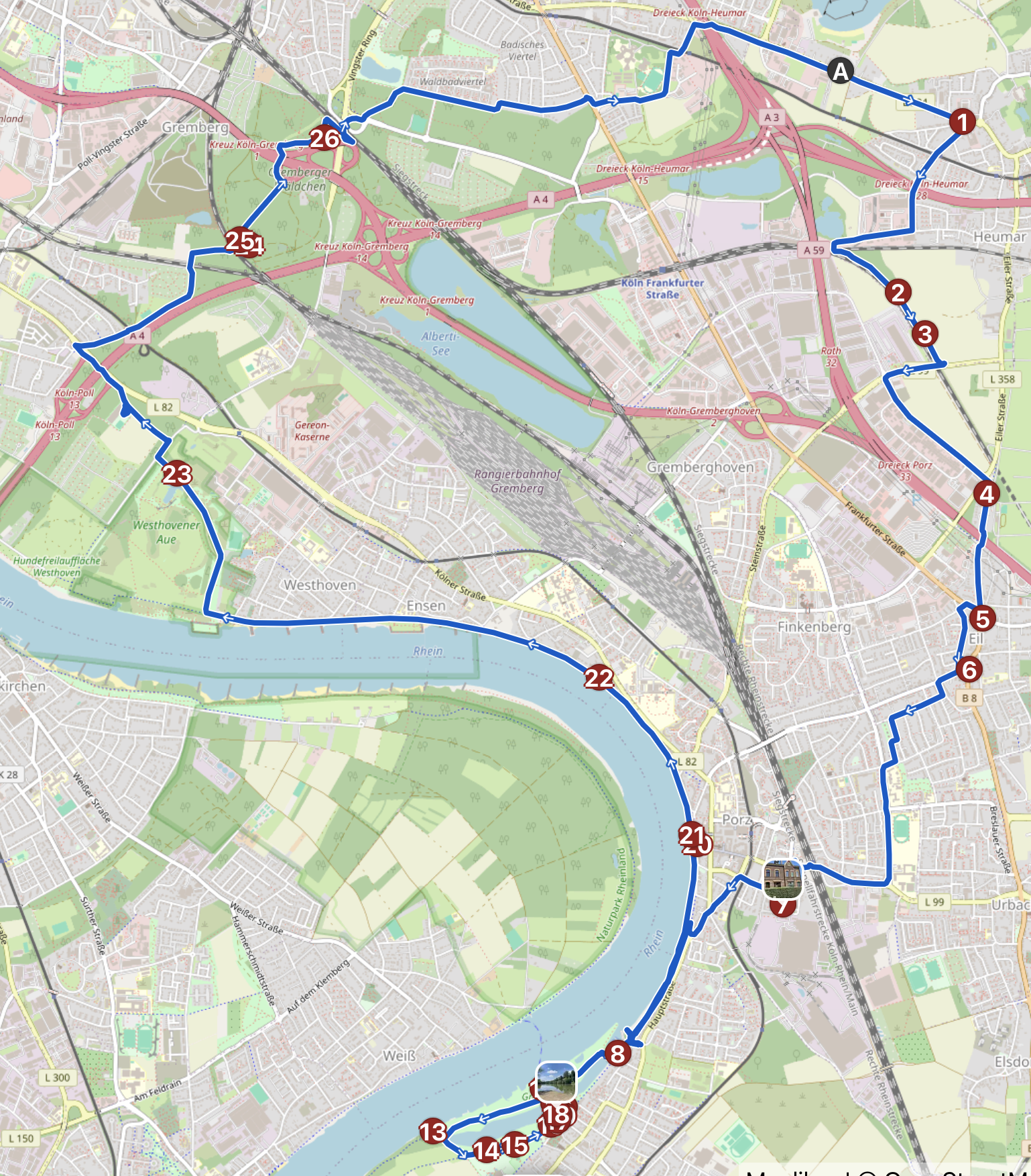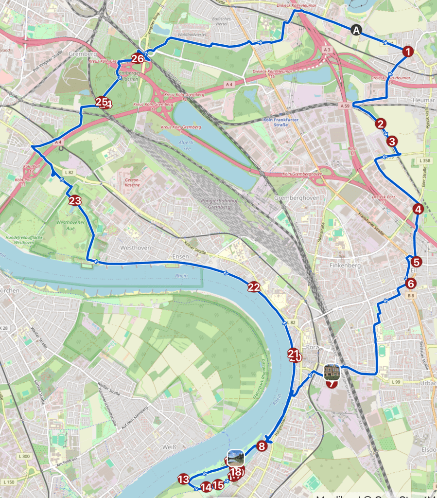 Das Wetter war gut, und ich war sowieso schon in Porz – also wollte ich danach noch an die Groov fahren. Der Hinweg war etwas nervig, weil ich ihn neu geplant habe, anstatt das Finanzamt einfach in meine bewährte Strecke:„Zündorf-kurz“ einzubauen. OSM kennt die neue Porzer Innenstadt noch nicht, und das macht es mit allen Systemen etwas schwierig.