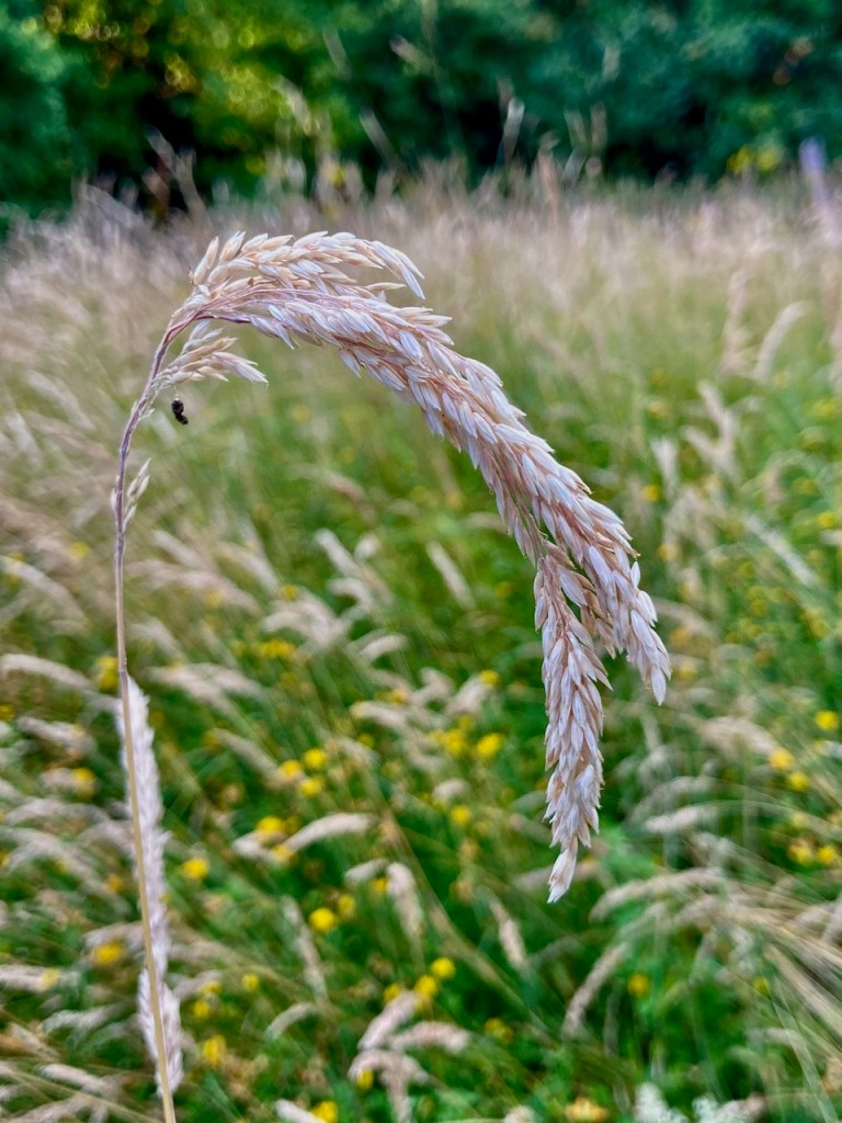 Auf der Wiese wachsen immer verschiedene Gräser, dieses Jahr dominiert das Wollige Honiggras. Zum Glück ist es nicht allzu hoch geworden. Eigentlich wäre jetzt ein guter Zeitpunkt zum Mähen, andererseits liegt die Wiese in der prallen Sonne. Wie man an den gelben Flecken sieht, kommt im Unterbewuchs schon wieder der Sumpf-Hornklee – obwohl es dieses Jahr gar keinen Sumpf gibt.